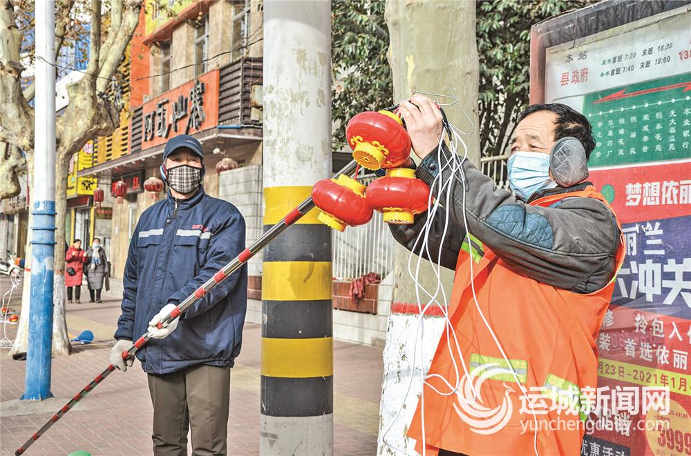 1月13日,工作人员在万荣县城街头安装彩灯。 为了迎接牛年新春的到来,万荣县及早动手,在县城主街道上,开始安装节日彩灯,有太阳花、彩色葫芦等造型的街灯。当夜幕降临,万荣街头流光溢彩,璀璨夺目,充满喜庆气氛。