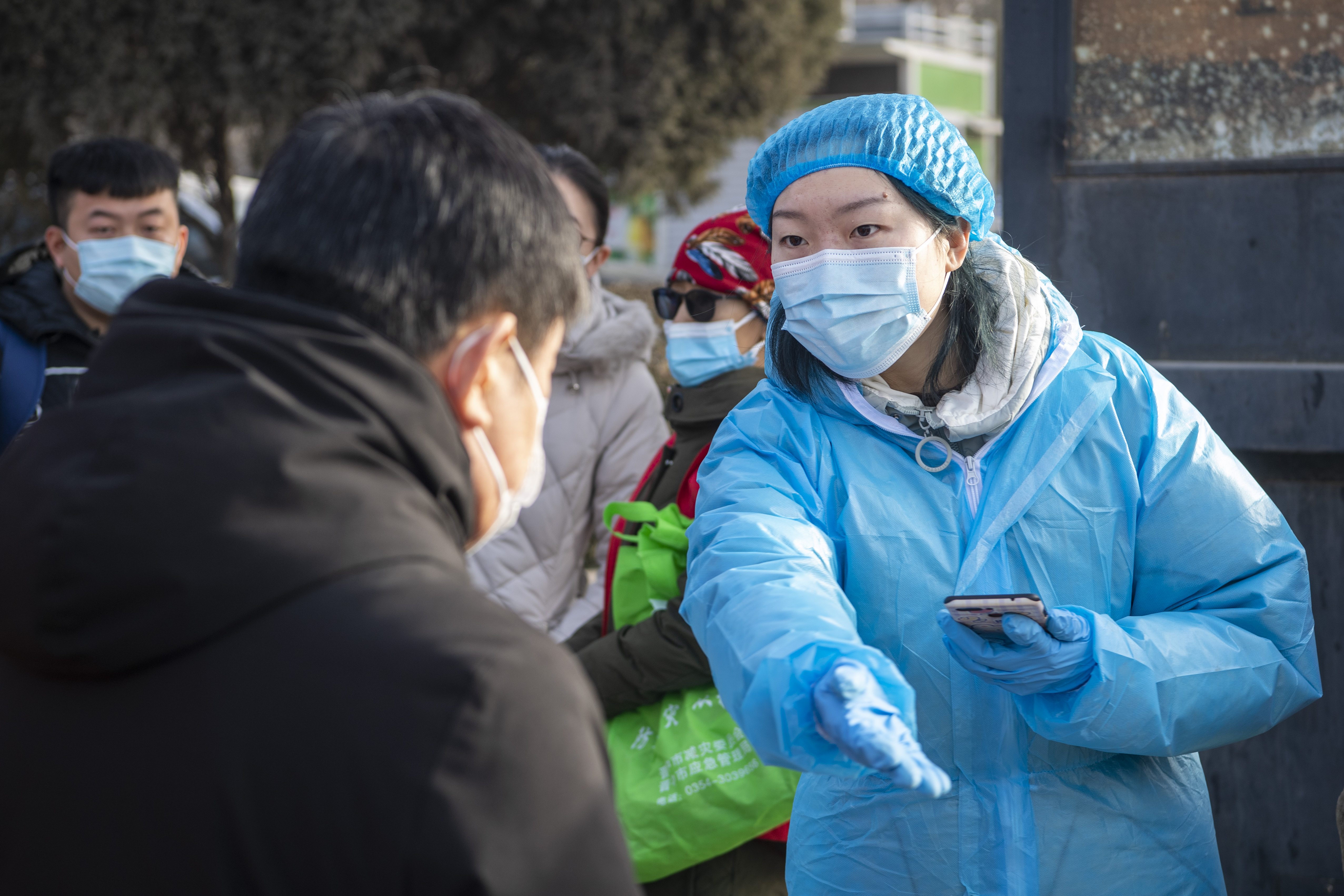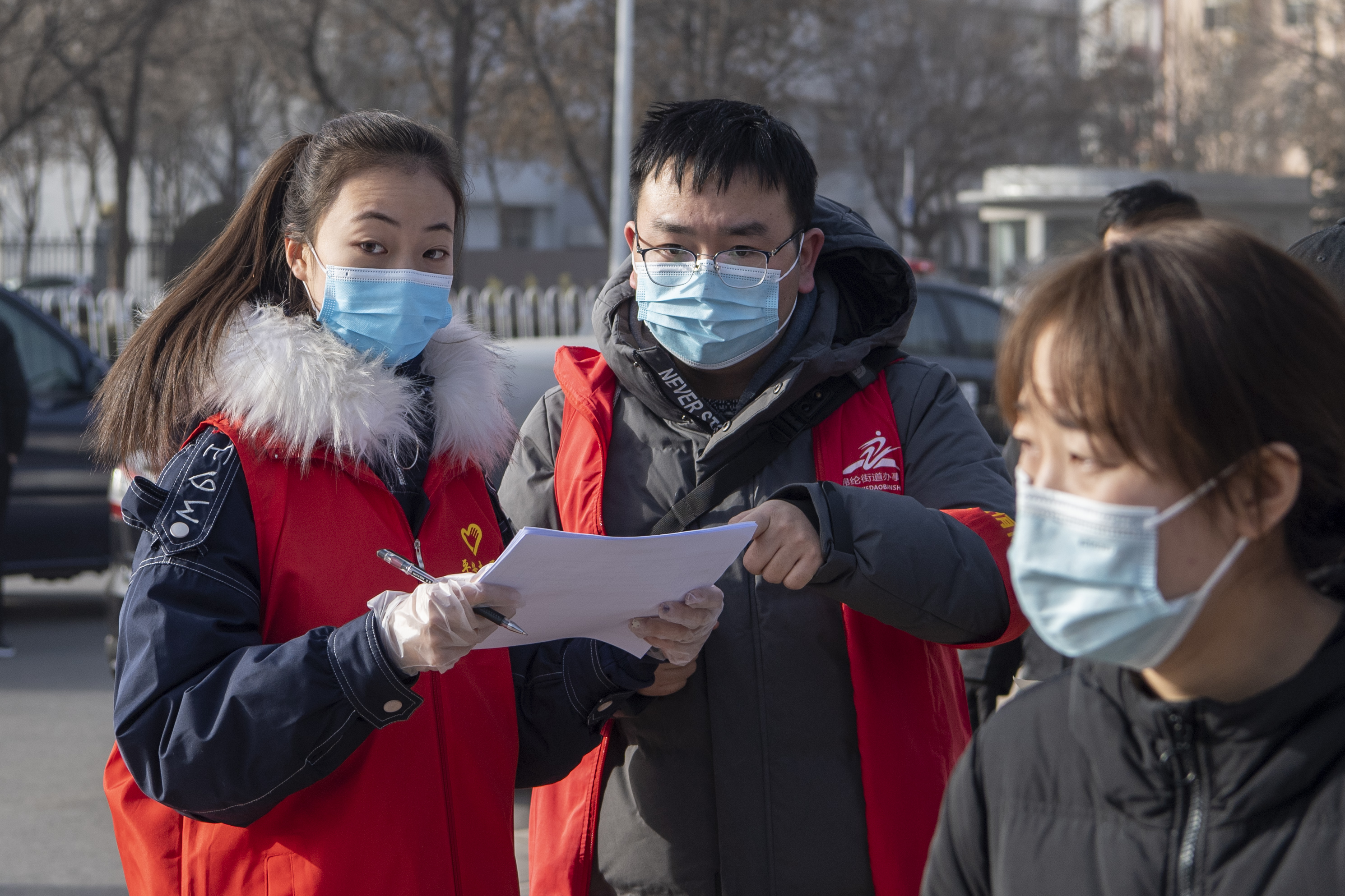 ▲1月13日,在山西省晋中市榆次区堡子社区核酸采样点,志愿者张天羽(右一)登记居民信息。新华社记者 马志异 摄