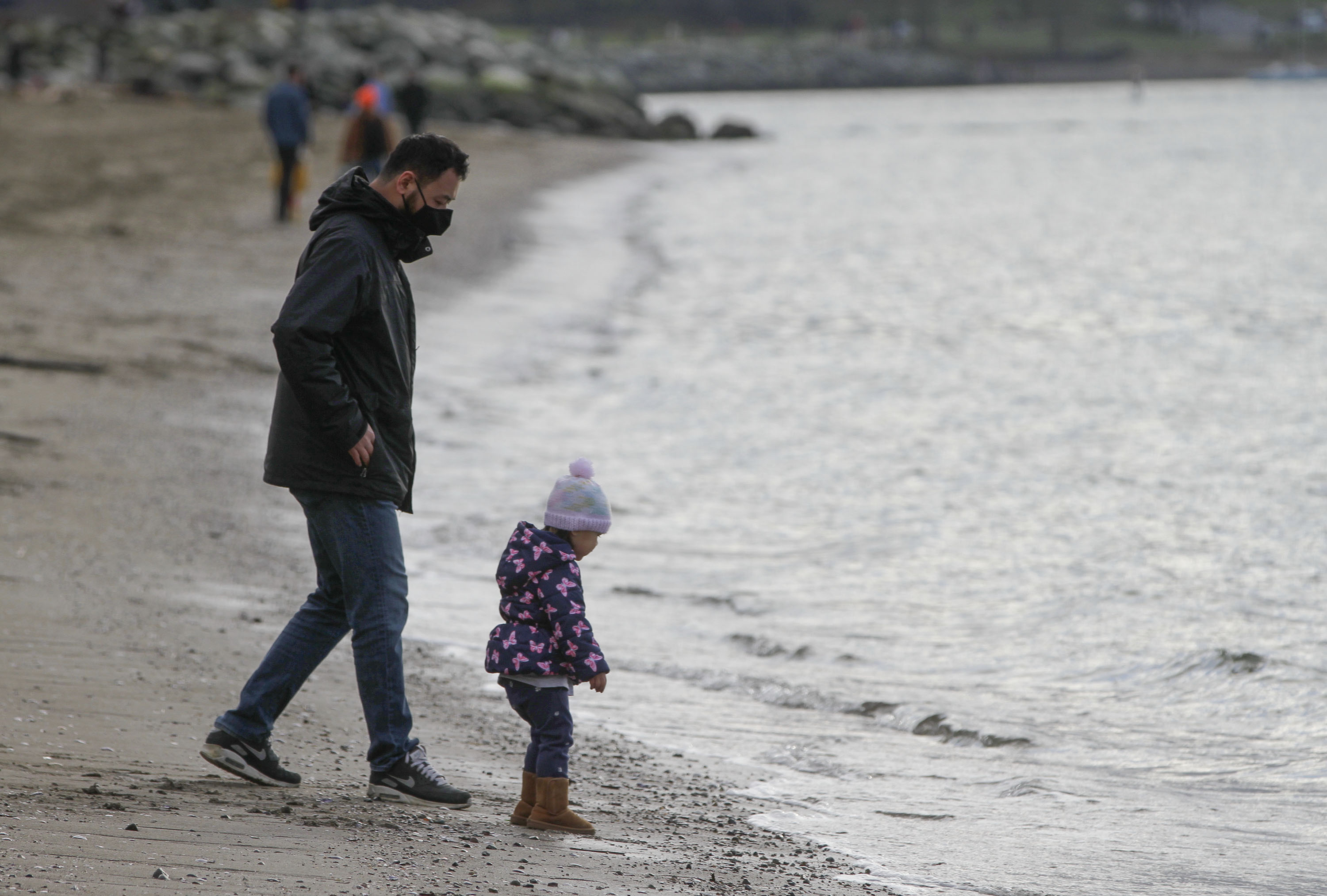 ▲1月17日,在加拿大温哥华,一名戴口罩的男子带着孩子在海边散步。截至当地16日中午,加拿大累计新冠确诊病例超70万。疫情下,温哥华仍有不少民众到海滩和公园散步,舒缓疫情压力。新华社发(梁森 摄)