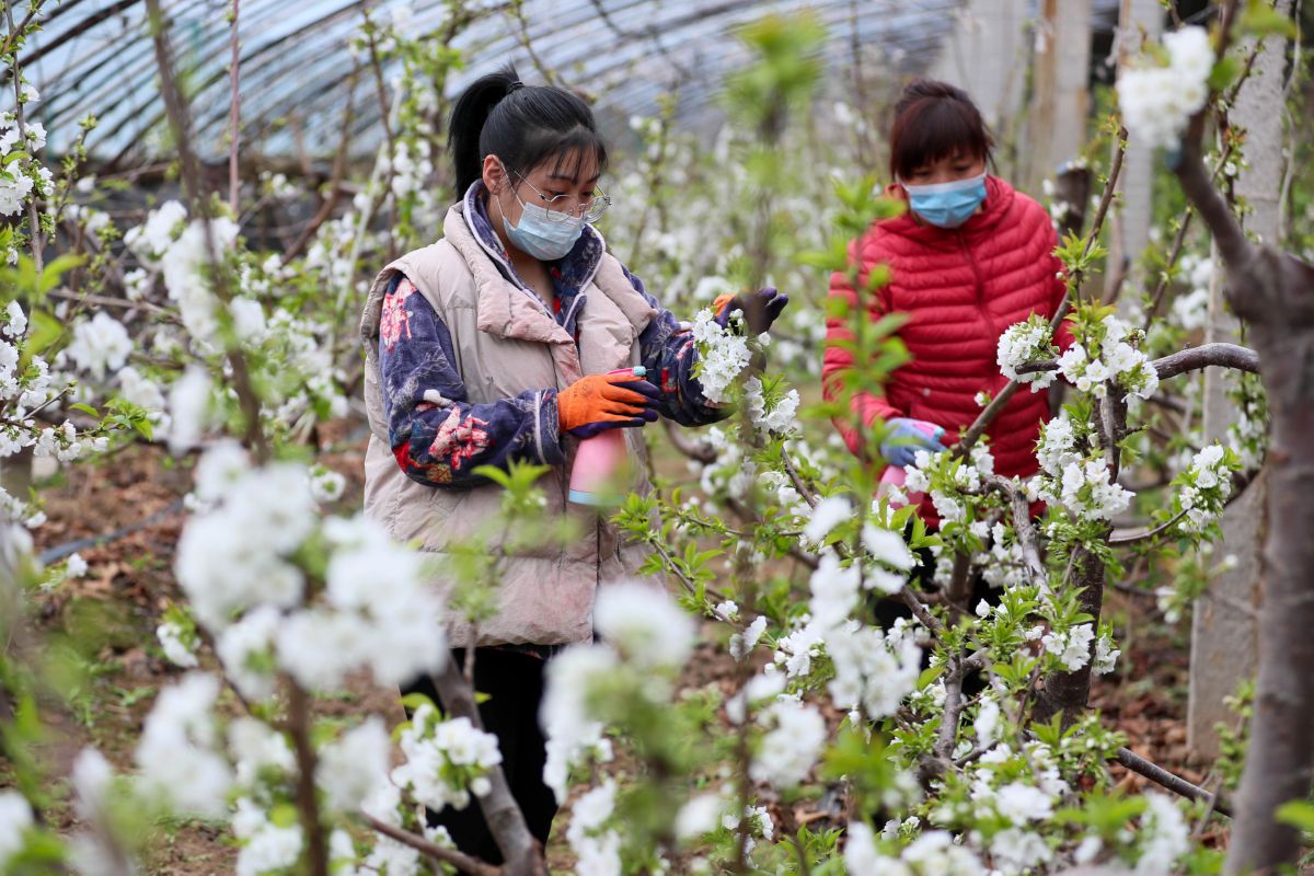 1月15日,盐湖区龙居镇赵村村民张玉平和女儿在自家樱桃大棚里人工授粉。