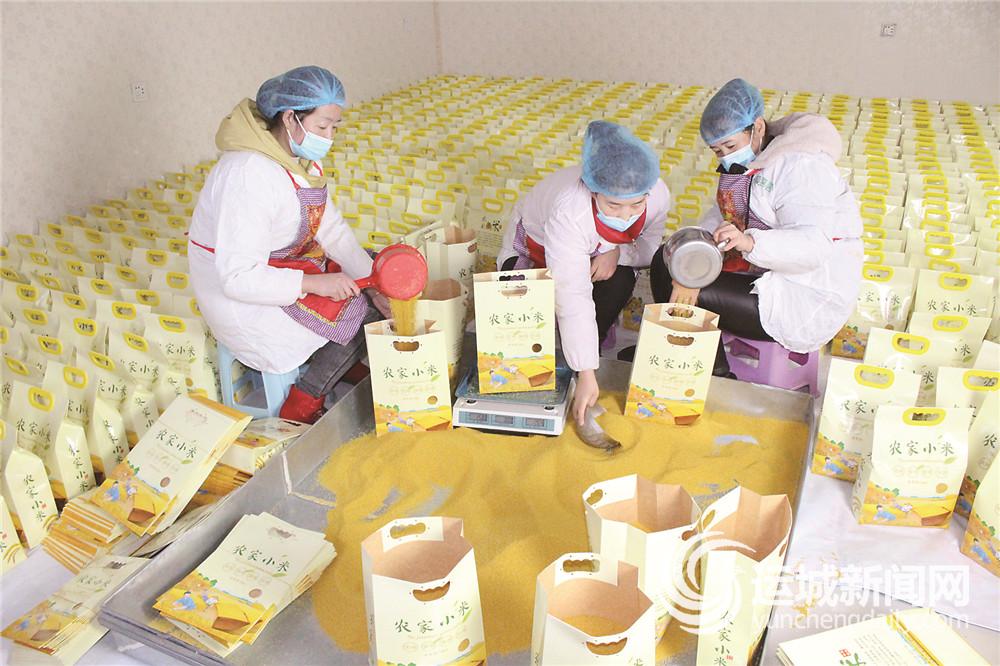 ▲1月14日,闻喜县河底镇桃沟村至诚种植家庭农场的员工忙着将小米装袋,准备销往北京市场。