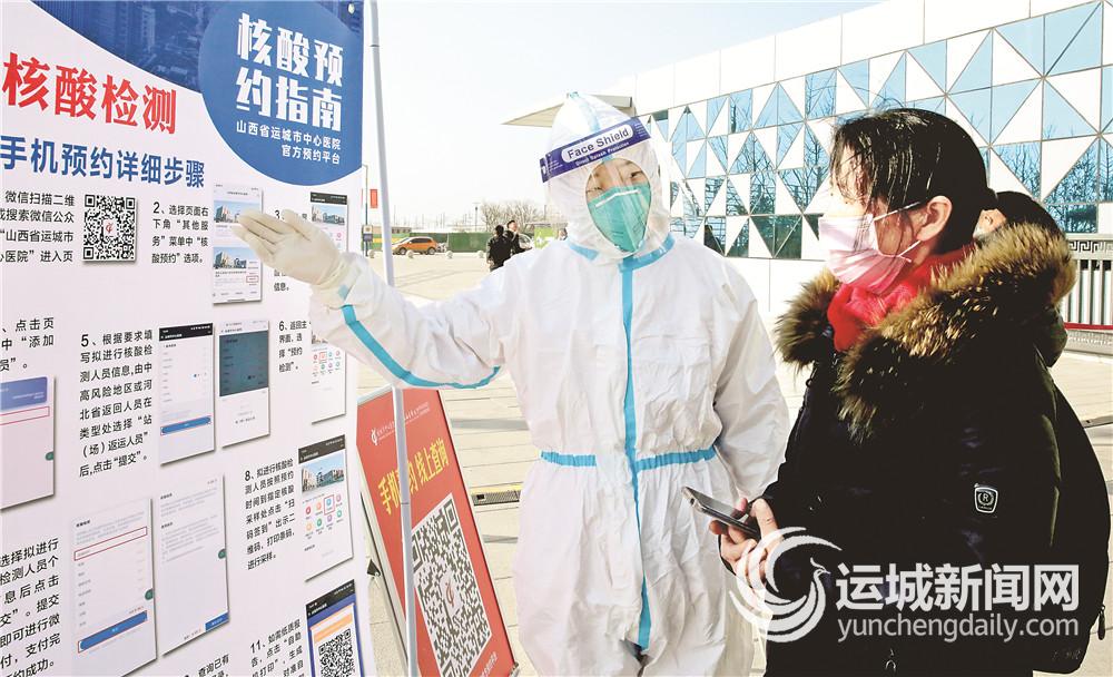 1月19日,运城市中心医院医护人员管爱瑜为出站的旅客介绍核酸检测预约指南。 为最大限度地方便群众,实现愿检尽检,运城市中心医院、运城市第一医院根据市新冠肺炎疫情防控指挥部的部署,在运城北站设立来(返)运人员核酸采集点。截至1月18日,运城市中心医院、运城市第一医院在运城北站核酸采集点共检测2131人次。