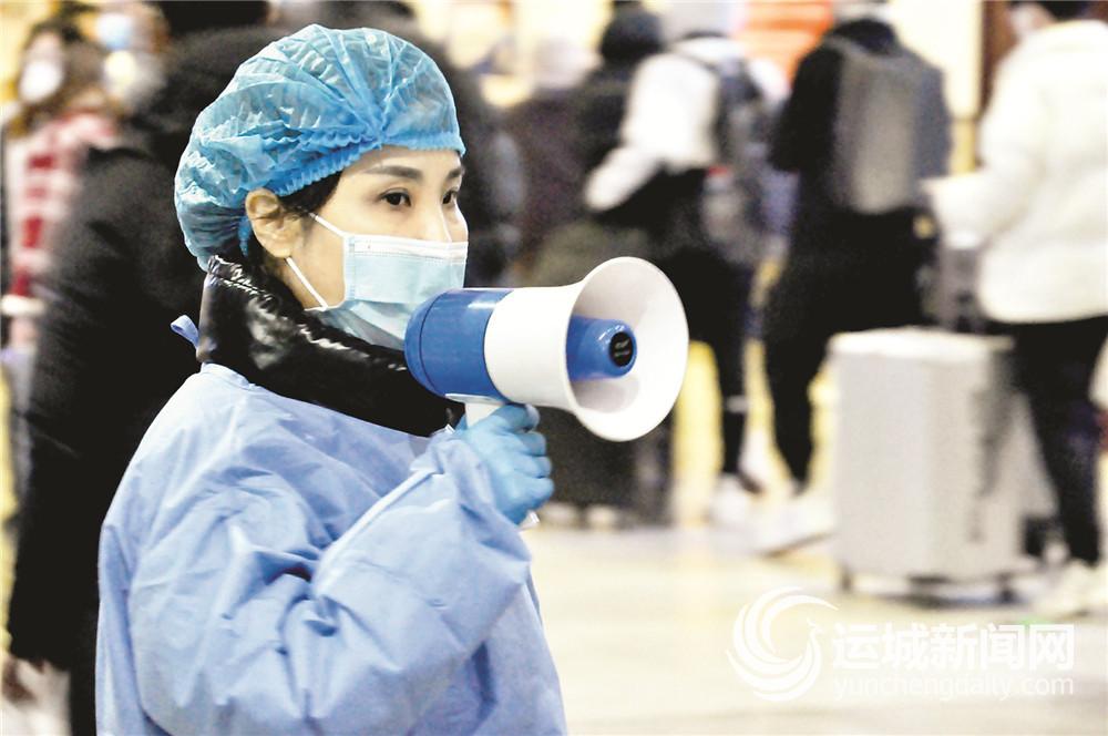 1月19日上午,运城北站的志愿者们有的通过大喇叭告知乘客如何扫描行程码,有的为乘客测量体温,有的配合医护人员进行信息登记。志愿者王鼎也是一名大学生,他说自己参加志愿服务,只是想为抗击疫情贡献自己的一份力量。