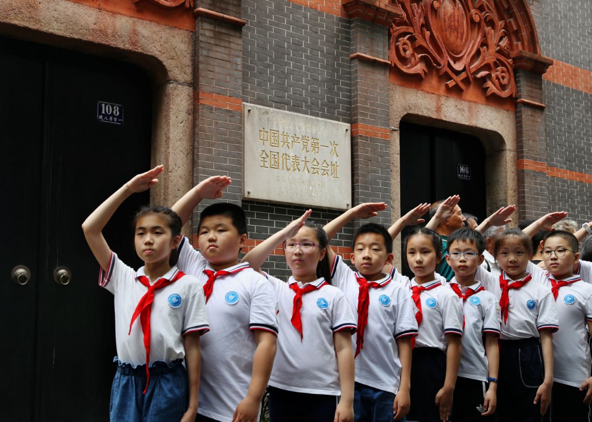 在中共一大会址前,上海市复旦万科实验学校的少先队员们在参观后合影留念(2019年6月27日摄)。 新华社记者 刘 颖 摄