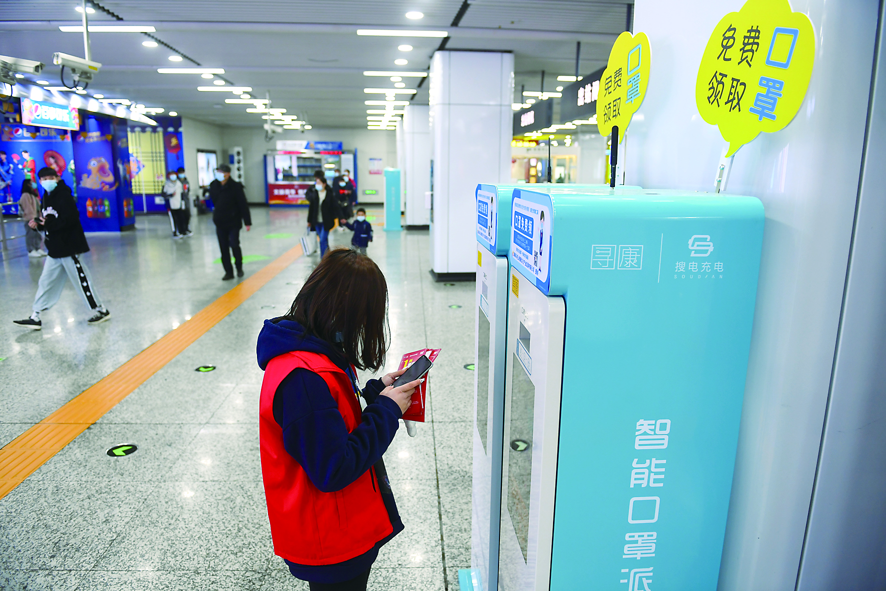 1月24日,在长沙地铁五一广场站,市民在智能口罩派发机上扫码领取口罩。