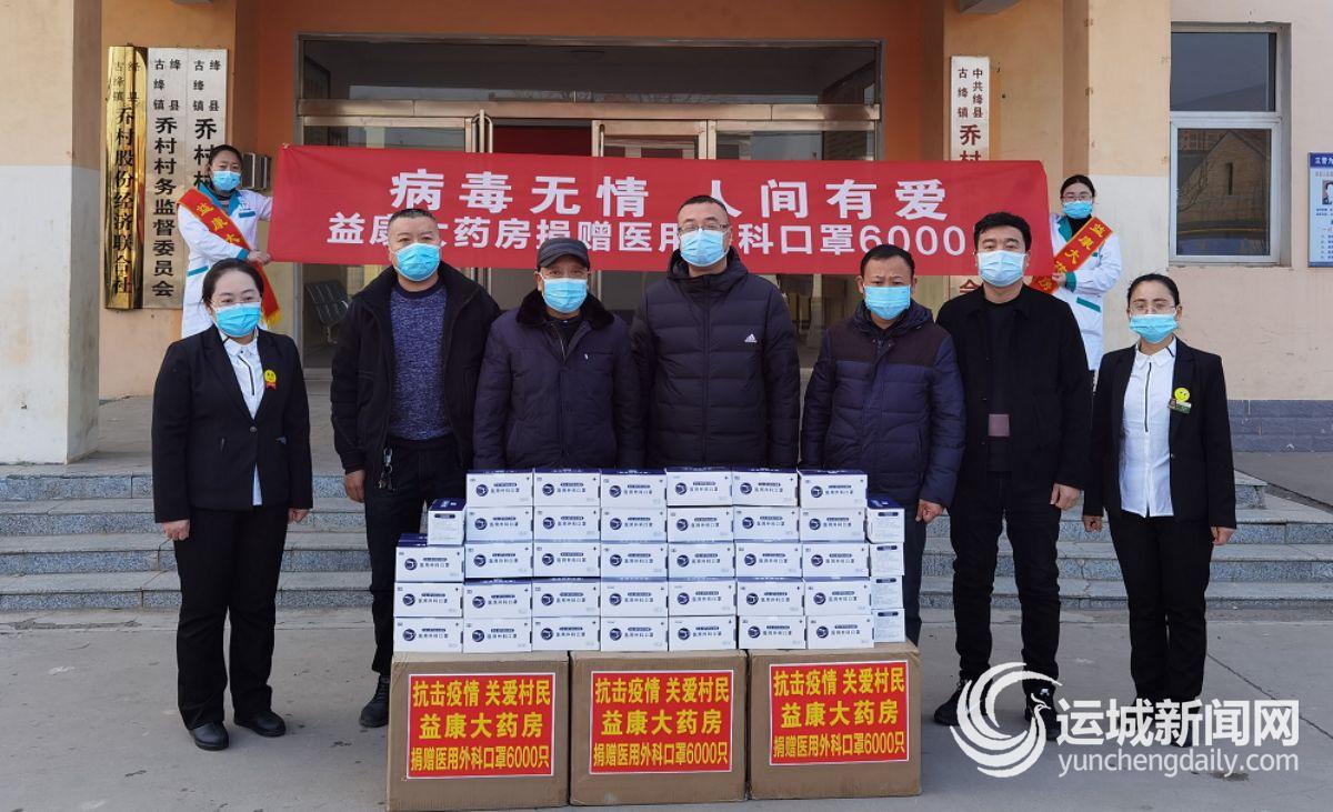 运城晚报讯 1月22日上午,在绛县古绛镇乔村村委会,该村党支部书记刘新华、村委会主任乔林涛等代表全体村民,接受了该村共产党员、“益康大药房”负责人乔亮豪(上图右二)为村民捐赠的6000只医用外科口罩。