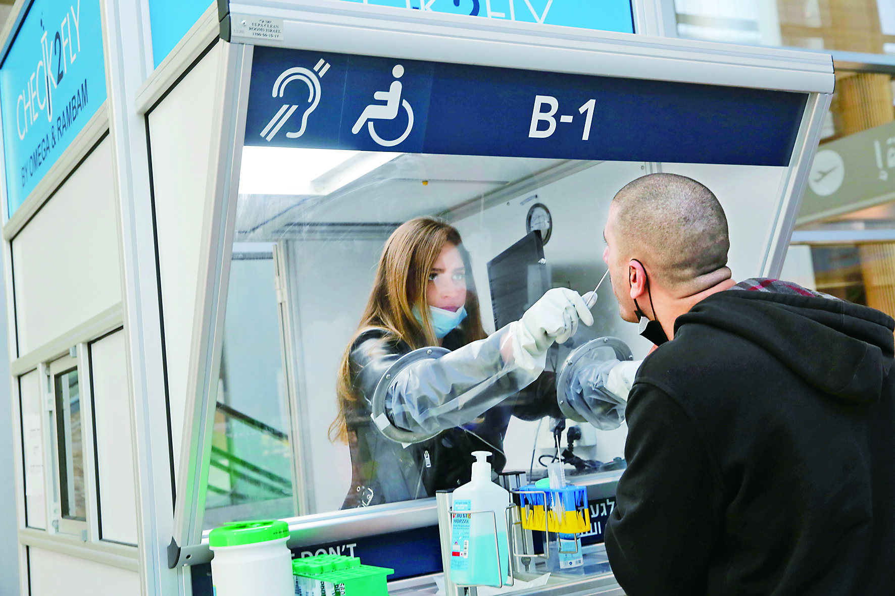 1月24日,在以色列本古里安国际机场,工作人员在快速新冠病毒检测点为旅客进行取样。