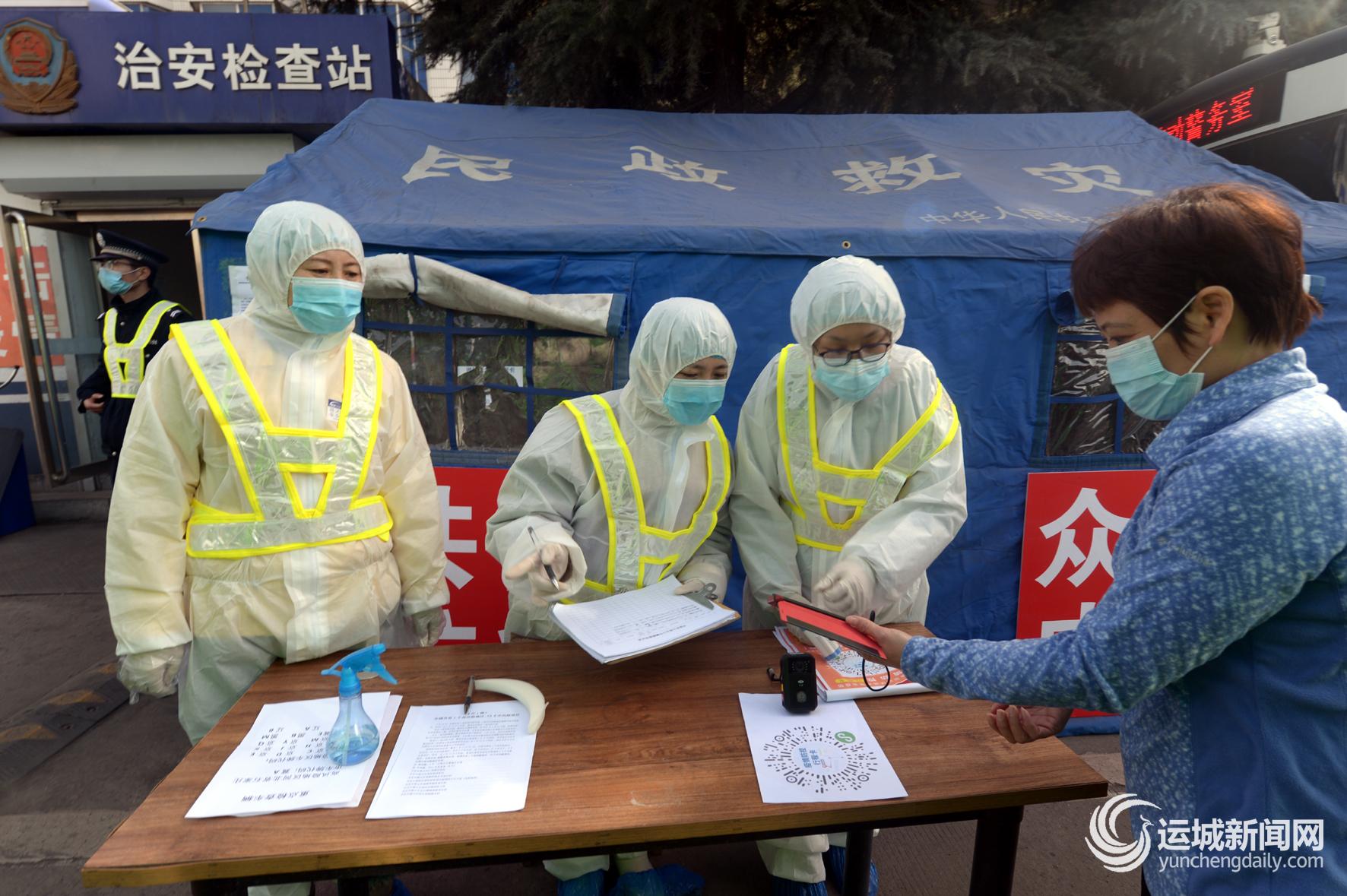 因疫情防控,我市卫健、公安、交警等部门在进入山西境内的三门峡黄河公路大桥、风陵渡黄河公路大桥、运城至风陵渡高速公路和运城至灵宝高速公路芮城进出口等分别设立疫情防控监测点,查验行程码,严格测温和登记,守好山西南大门。