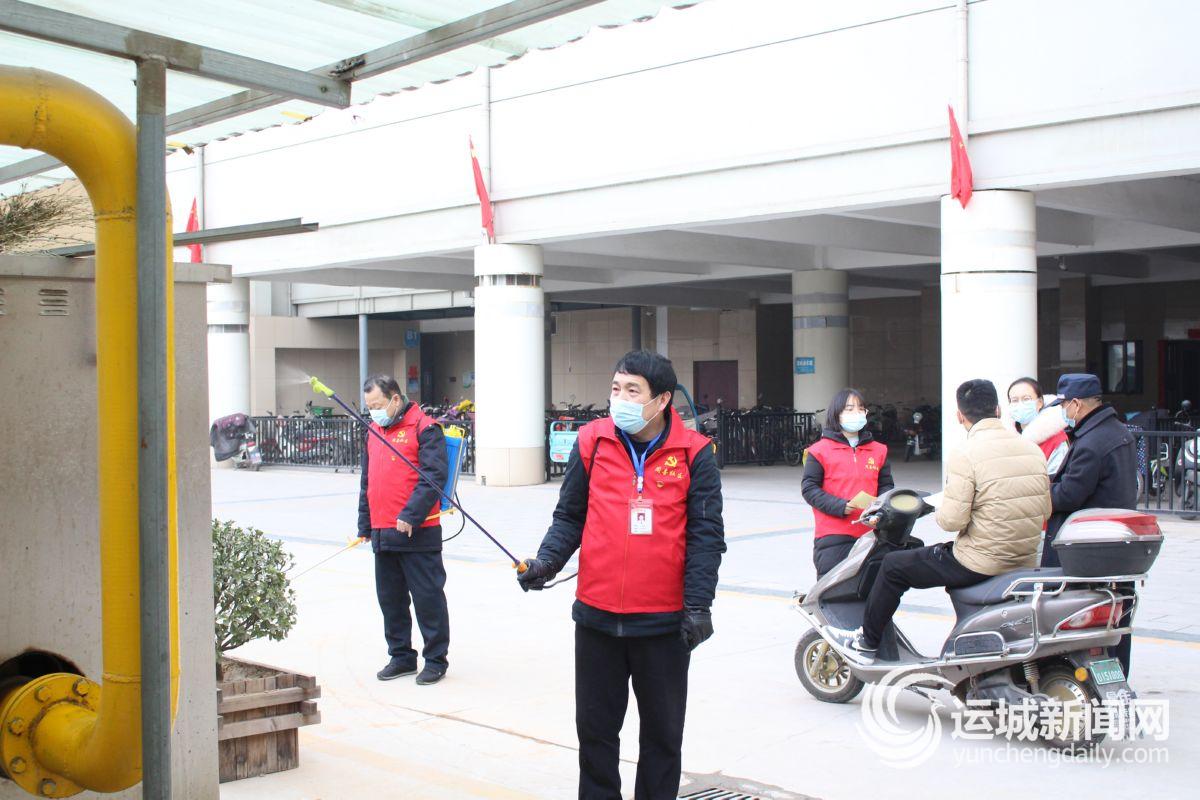 1月24日,闻喜县中城社区党员志愿者在辖区丽水华庭小区喷洒消毒液。
