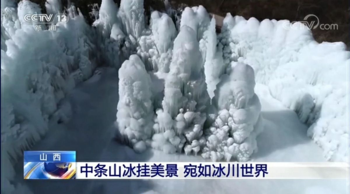 主持人在这段40余秒的报道中介绍,近一段时间,山西中条山仿佛变成了冰川世界,有银装素裹的峡谷、玲珑剔透的冰挂。通过航拍画面可以看到,位于中条山西段的五老峰,漫山遍野的植被和奇峰怪石被透明的冰层包裹着,在五老峰的山地上,形成一幅幅绝妙的水晶幕帘。阳光照耀下,冰川、冰挂、冰瀑晶莹剔透,造型各异。流淌的河水与冰挂一动一静,相映成趣。据了解,这样的冰川是五老峰冬日里特有的美景,时间短暂,每年只有1个月左右的观赏期。