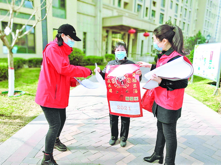 社区志愿者向居民发放禁毒挂历
