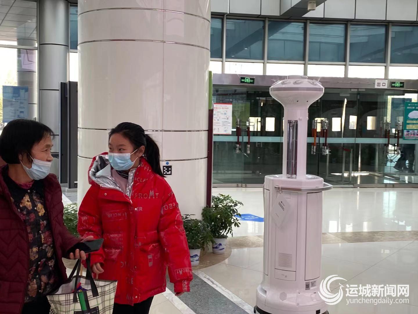 ▲2月1日,市中心医院门诊大厅,两名前来就诊的市民从该院新引进的钛米消毒机器人前路过。