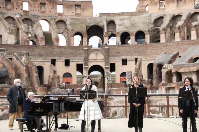 2月1日,在意大利首都罗马,音乐家在重新开放的斗兽场内表演。该国大部地区从1日起降入最低风险级别,放松疫情管控措施。 新华社记者 程婷婷 摄