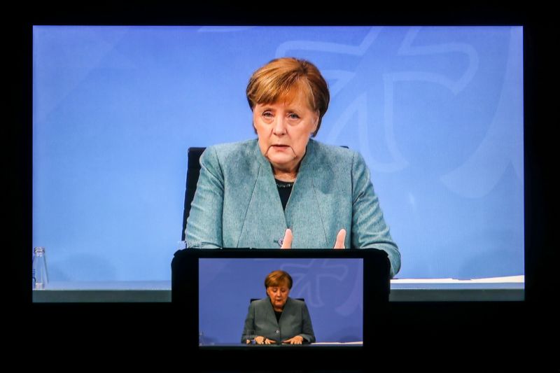 2月1日,屏幕上播放着德国总理默克尔在柏林出席新闻发布会的视频画面。默克尔表示,德国“在今年夏季结束前向所有公民提供新冠疫苗”的目标可实现。 新华社记者 单宇琦 摄