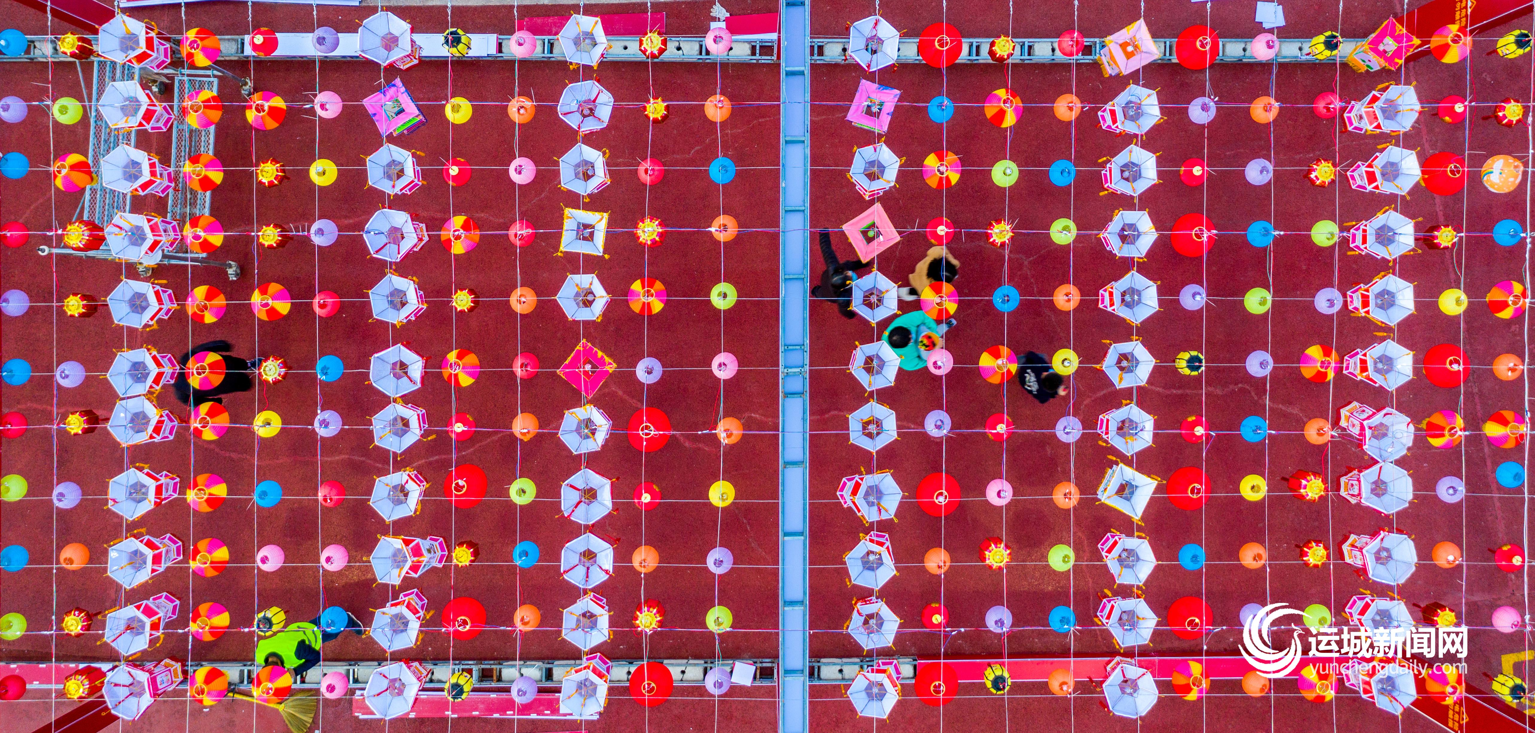 春节临近,运城市体育公园内,工人们忙着搭建彩虹门、安装各式灯笼,为城市营造温馨、和谐、喜庆的节日气氛。 图为2月2日,在市体育公园内已经安装好的灯谜灯笼长廊。