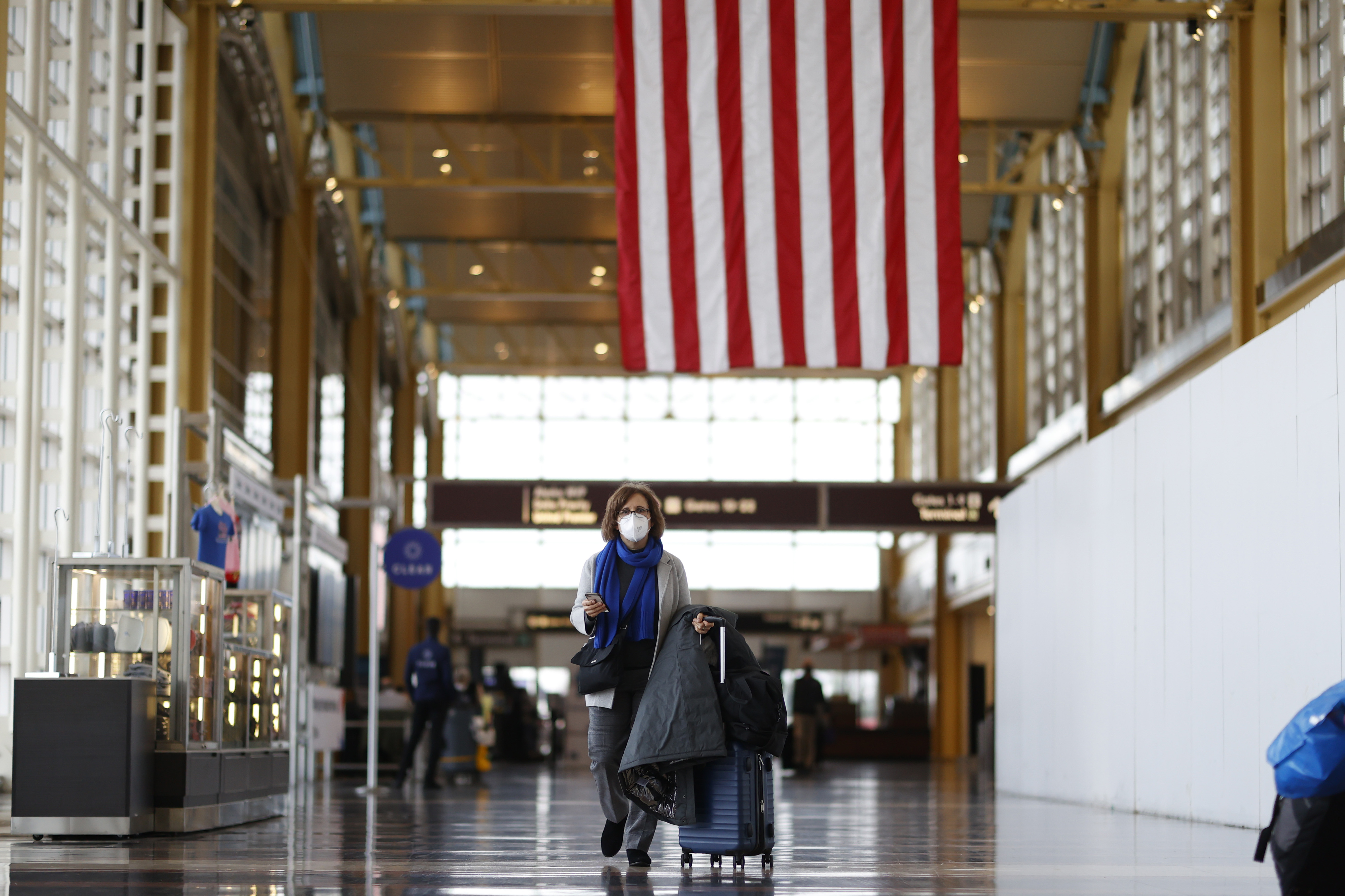 ▲2月2日,在美国弗吉尼亚州阿灵顿的罗纳德·里根华盛顿国家机场,旅客戴着口罩走在航站楼内。