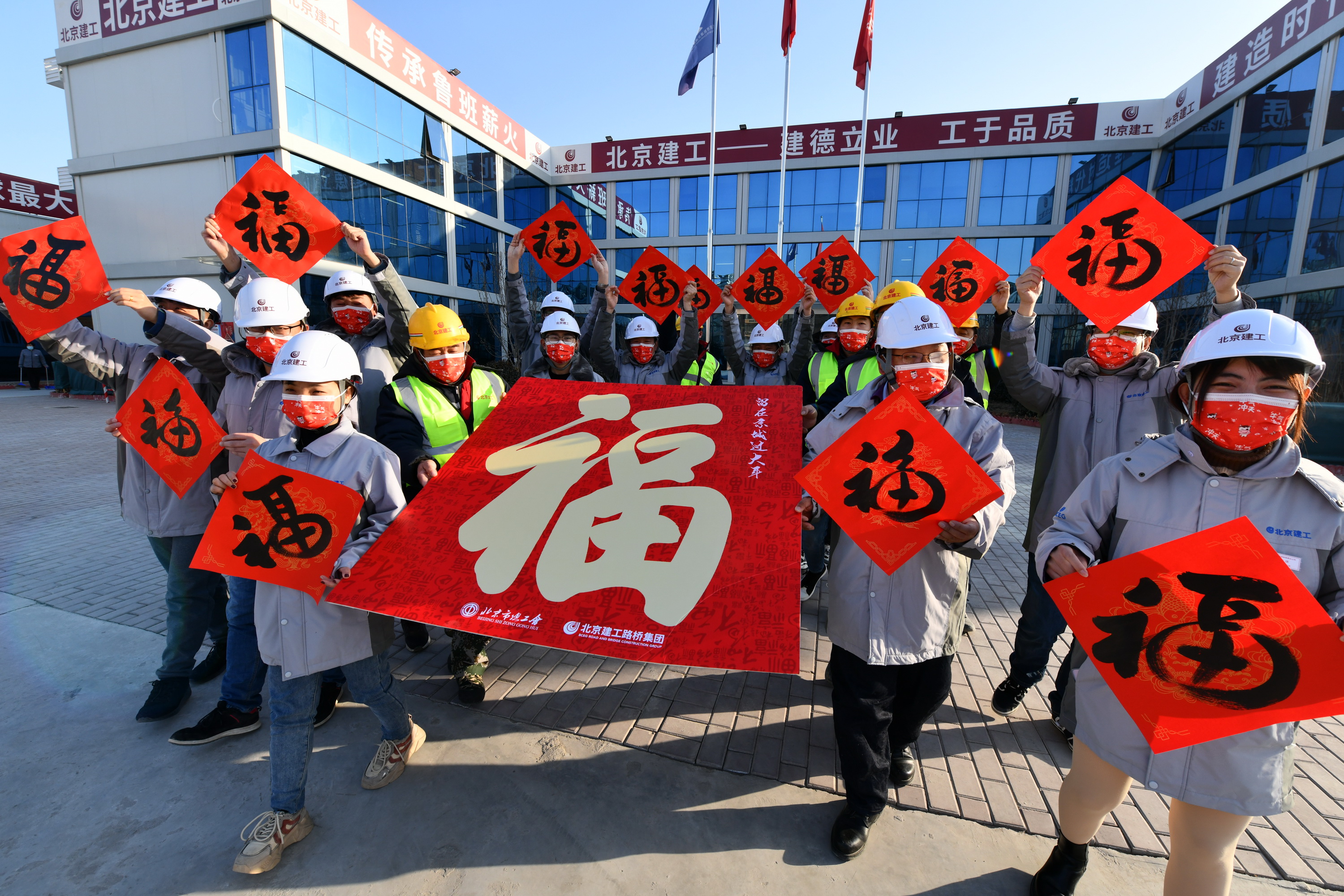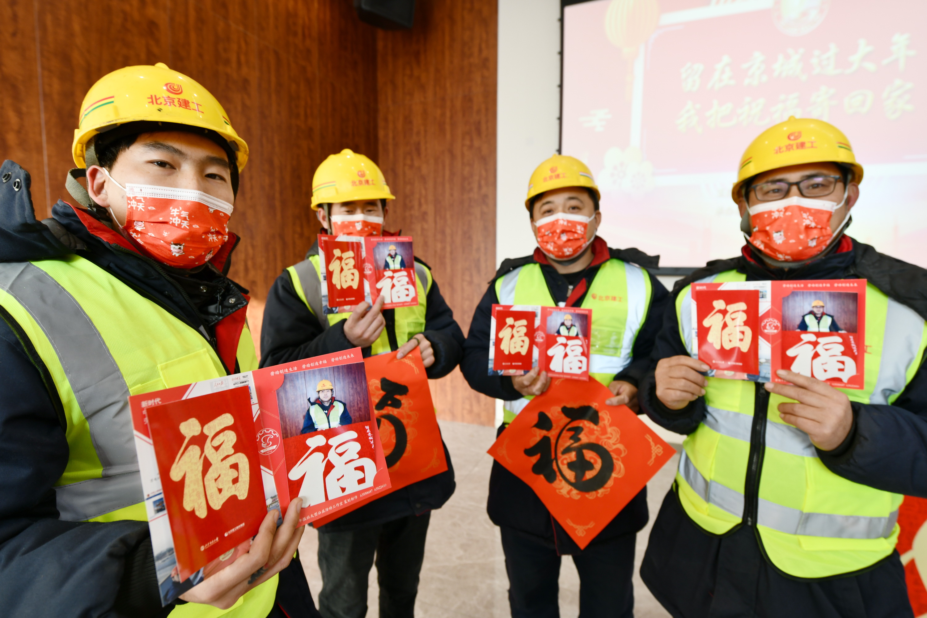 ▲2月3日,北京建工路桥集团留京过年的技术员和工人们展示他们收到的“福”字。