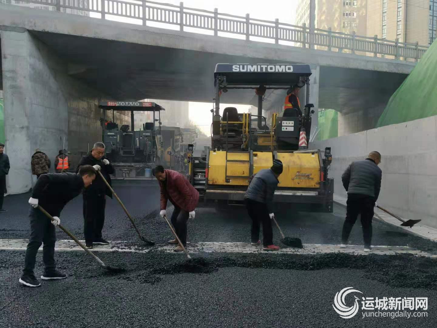 运城晚报讯(记者 祁克宁)2月3日,在人民路下穿铁路立交桥项目施工现场,摊铺机正在对主车道进行铺油作业。人民路下穿铁路立交桥项目负责人说,该项目主车道铺油工作结束后,施工人员将完善道路标识、标线等,预计2月6日主车道正式通车。