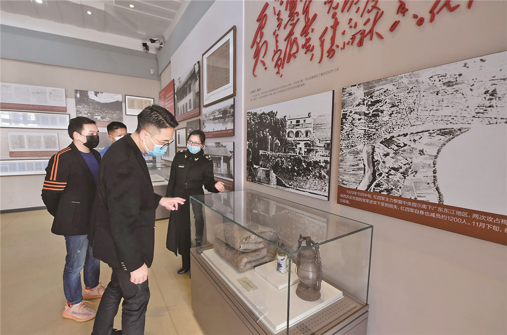 1月25日,讲解员廖晓婕(右一)在古田会议纪念馆向参观者介绍旧棉絮的故事。 新华社记者 林善传 摄