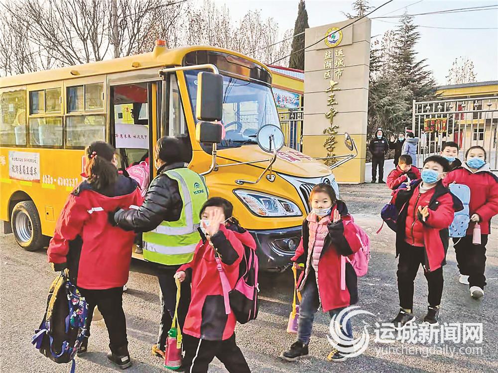 近日,盐湖区上王中心学校的学生放学后准备乘校车回家。李宏伟 摄