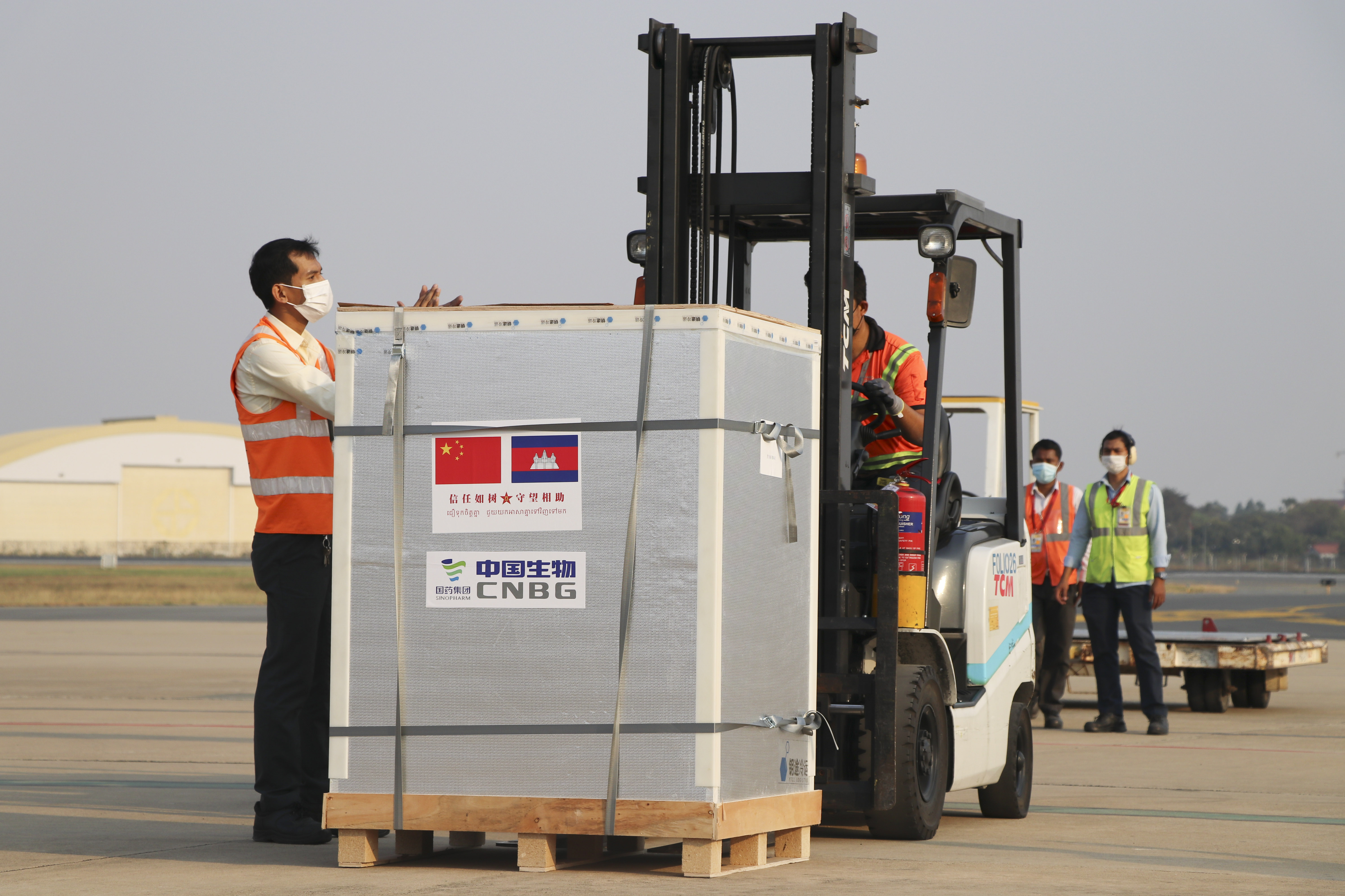 ▲2月7日,在柬埔寨金边国际机场,工作人员接运中国援柬新冠疫苗。中国援柬首批新冠疫苗7日运抵柬埔寨首都金边,柬埔寨首相洪森前往金边国际机场迎接中国疫苗。 新华社发(高炳南 摄)