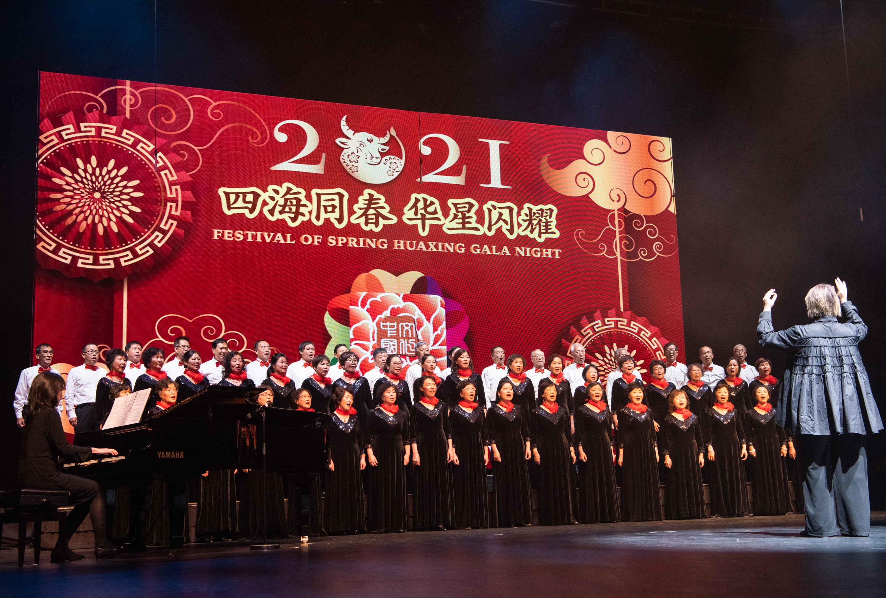 ▲2月7日,在新西兰奥克兰举行的华侨华人新春晚会上,演员合唱歌曲《茉莉花》。当晚,由新西兰华星艺术团主办的2021“四海同春·华星闪耀”华侨华人新春晚会在新西兰最大城市奥克兰举行。新华社发(孙学良 摄)