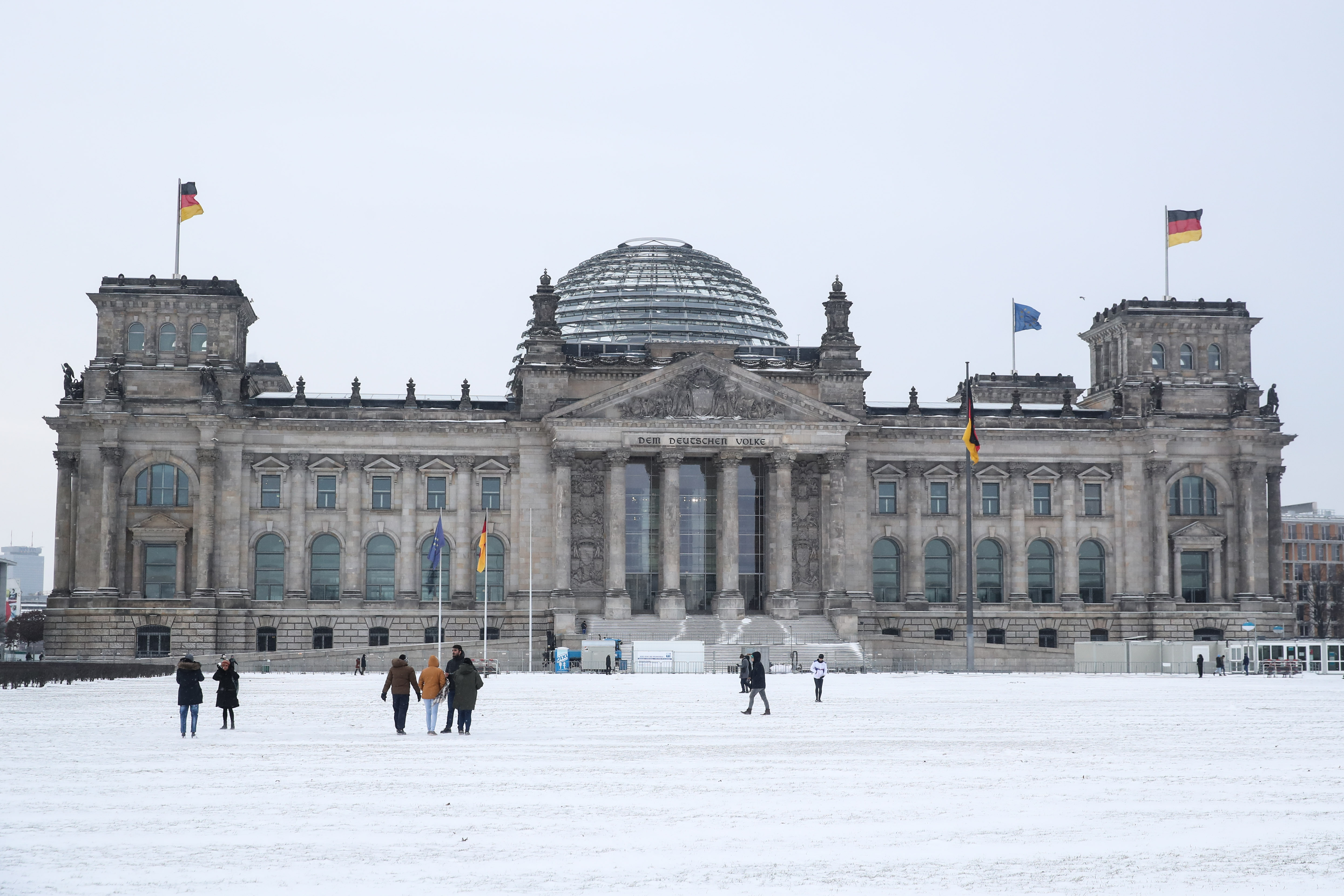 ▲2月7日,在德国首都柏林,人们站在德国国会大厦前的雪地上。当日,德国北部及中部多地迎来强降雪,造成部分公共交通停止运营。 新华社记者 单宇琦 摄