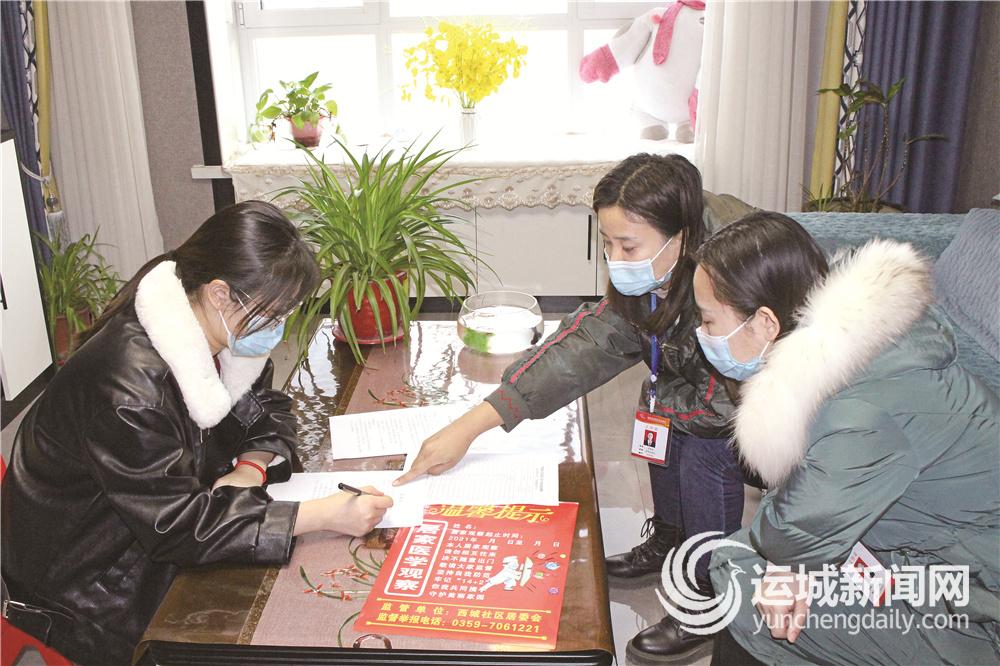 2月7日,闻喜县西城社区工作人员在指导返乡人员(左)签订承诺书。