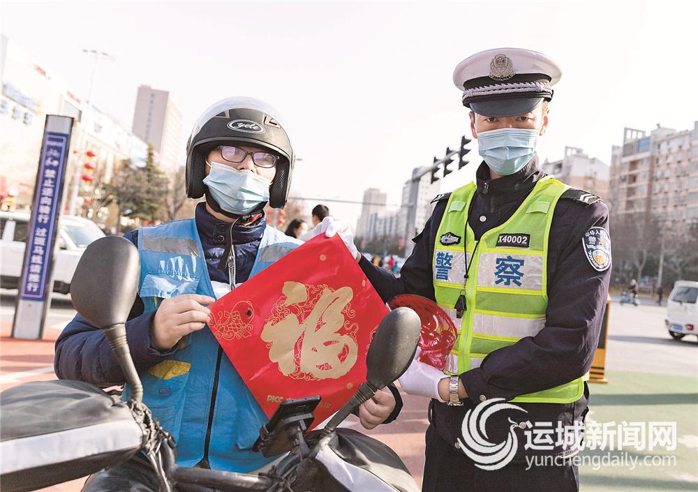 “你好,送你一副春联。”被拦住的外卖配送员还有些错愕,“因为你主动佩戴了安全头盔,我们今天的活动就是对积极遵守交通规则的市民送上祝福。”盐湖区交警大队的一名民警解释道。