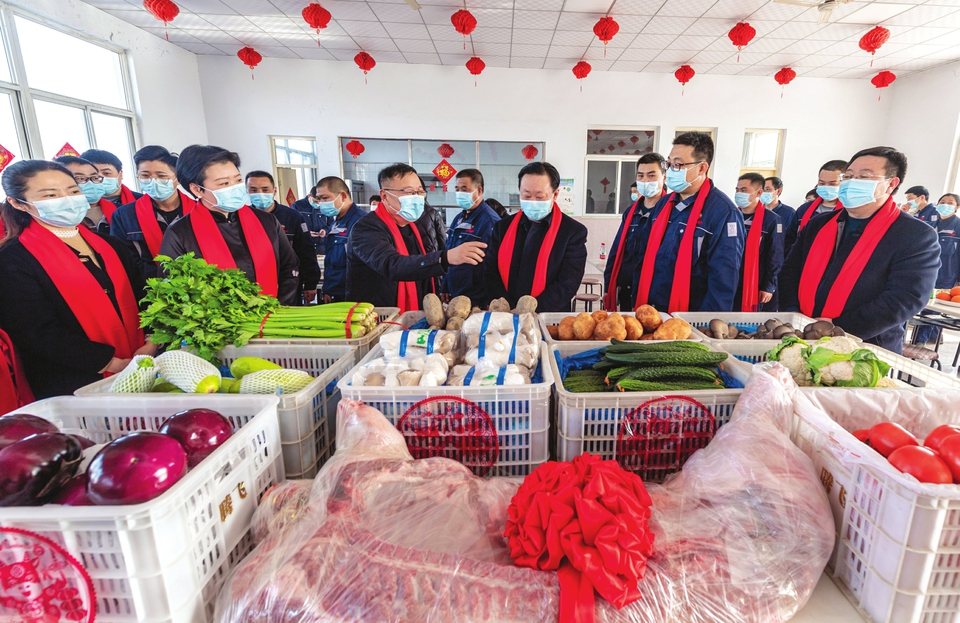 运城经济技术开发区开展“情暖务工人员”慰问活动,为就地过年的员工送去猪肉、蔬菜等年货。