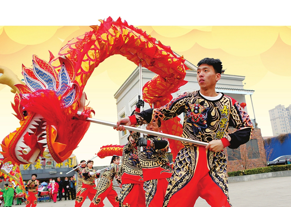 2月13日,在襄汾县丁陶风情街,民间艺人在表演传统节目《龙腾盛世》。春节期间,各地民间艺人纷纷走上街头,用丰富多彩的传统民俗表演闹新春。
