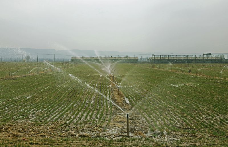 2月19日,在河津市阳村乡黄河滩和平农场的麦田里,喷灌设施正在对小麦进行节水灌溉。