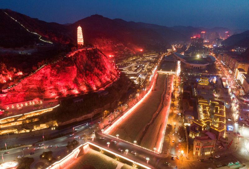 ▲宝塔山下延安城区夜景(2月8日摄,无人机照片) 新华社记者 邵瑞 摄