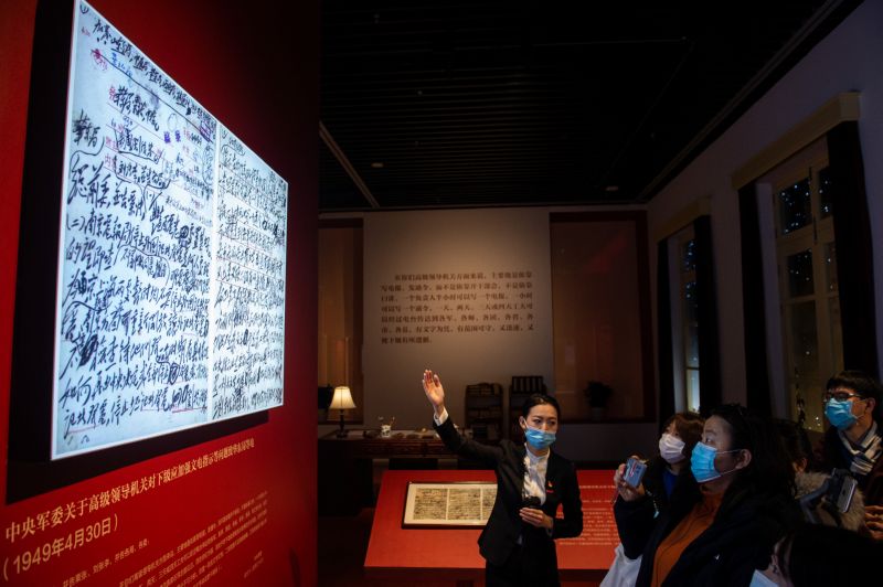 ▲“毛泽东同志香山时期发布电报手稿专题展览”在北京香山革命纪念馆开展,讲解员(左一)向媒体记者介绍电报内容(2020年12月16日摄)。 新华社记者 陈钟昊 摄