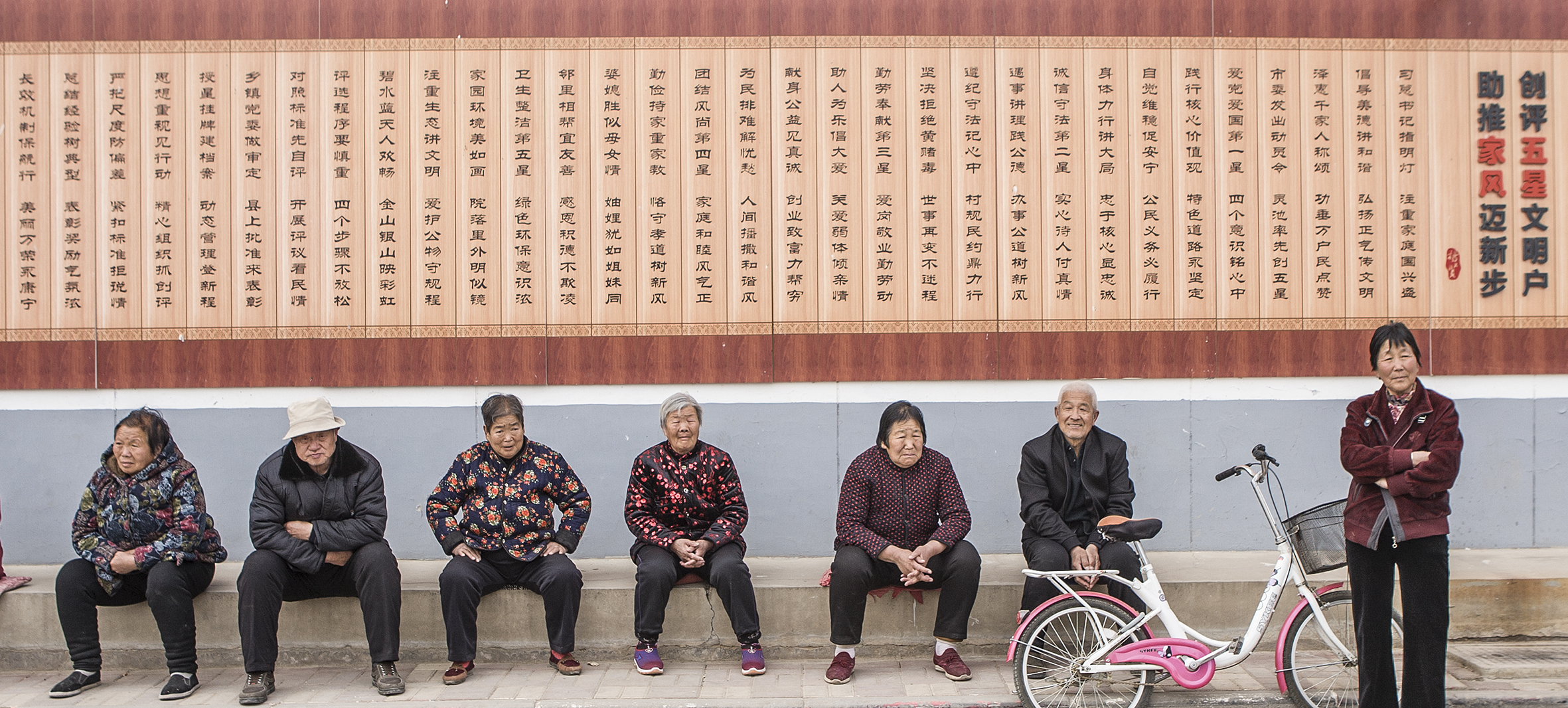 ▲2月17日,万荣县皇甫乡灵池村的几位老人,坐在村里的《创评“五星”文明户》壁文下。