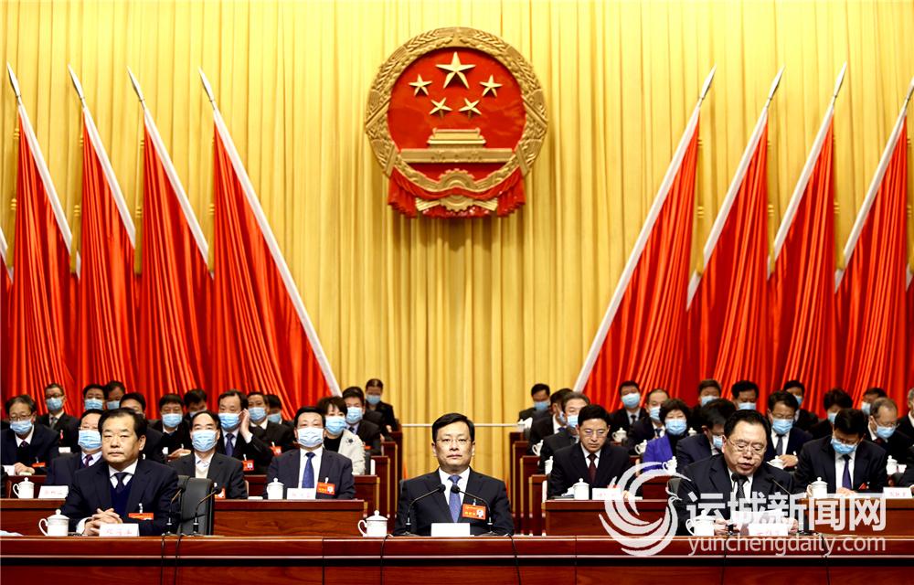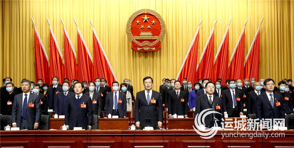 会场气氛庄重热烈,主席台帷幕正中的国徽在鲜艳的红旗映衬下熠熠生辉,“高举习近平新时代中国特色社会主义思想伟大旗帜 凝聚全市人民智慧力量 为夺取运城‘十四五’经济社会发展新胜利而努力奋斗!”标语高悬,振奋人心。