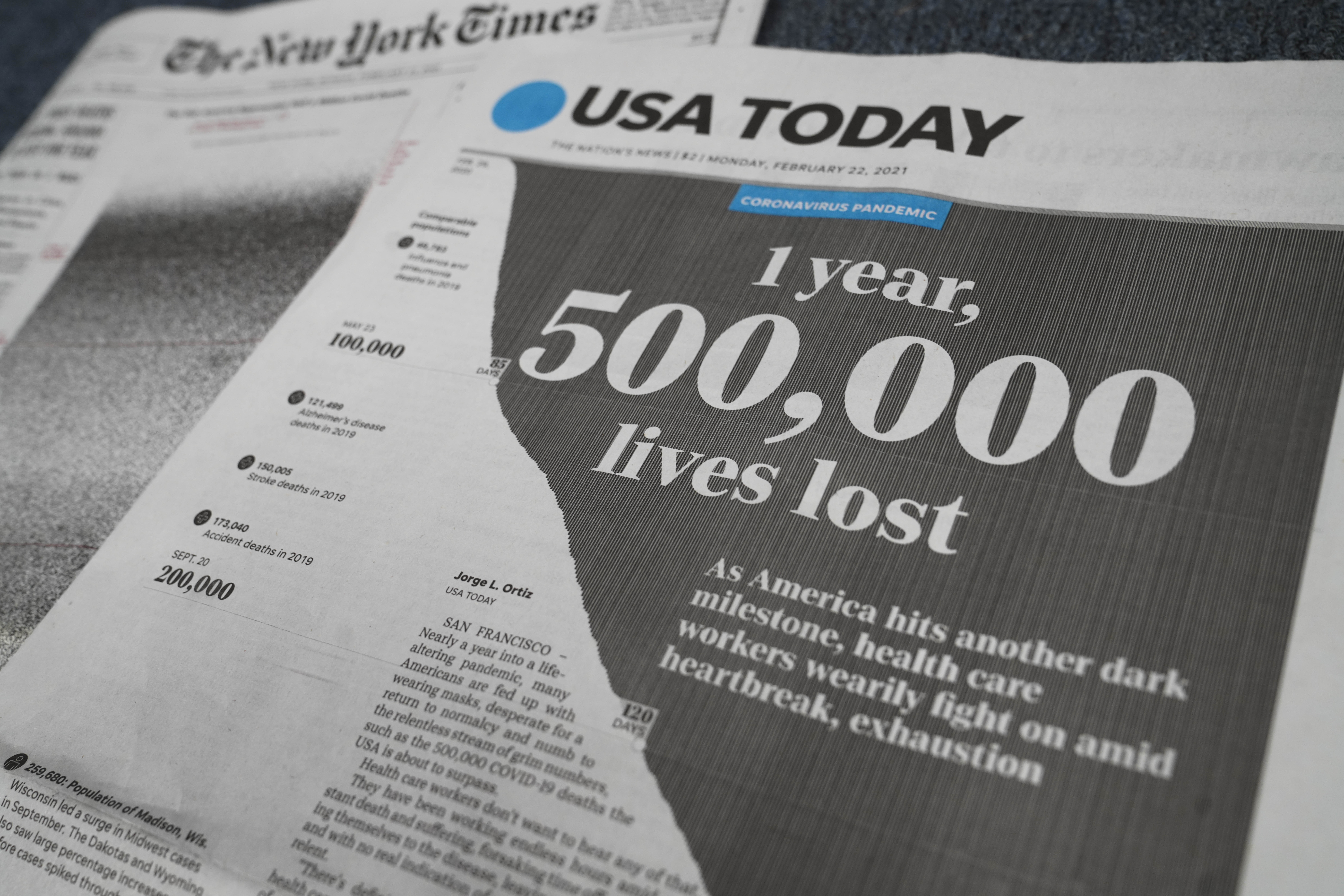 2月22日出版的《今日美国》报头版整版报道,美国累计新冠死亡病例超50万例。美国约翰斯·霍普金斯大学22日发布数据,截至美国东部22日16时24分(北京23日5时24分),美国累计新冠死亡病例超50万,达500071例,累计确诊28174133例。 新华社记者 王迎 摄