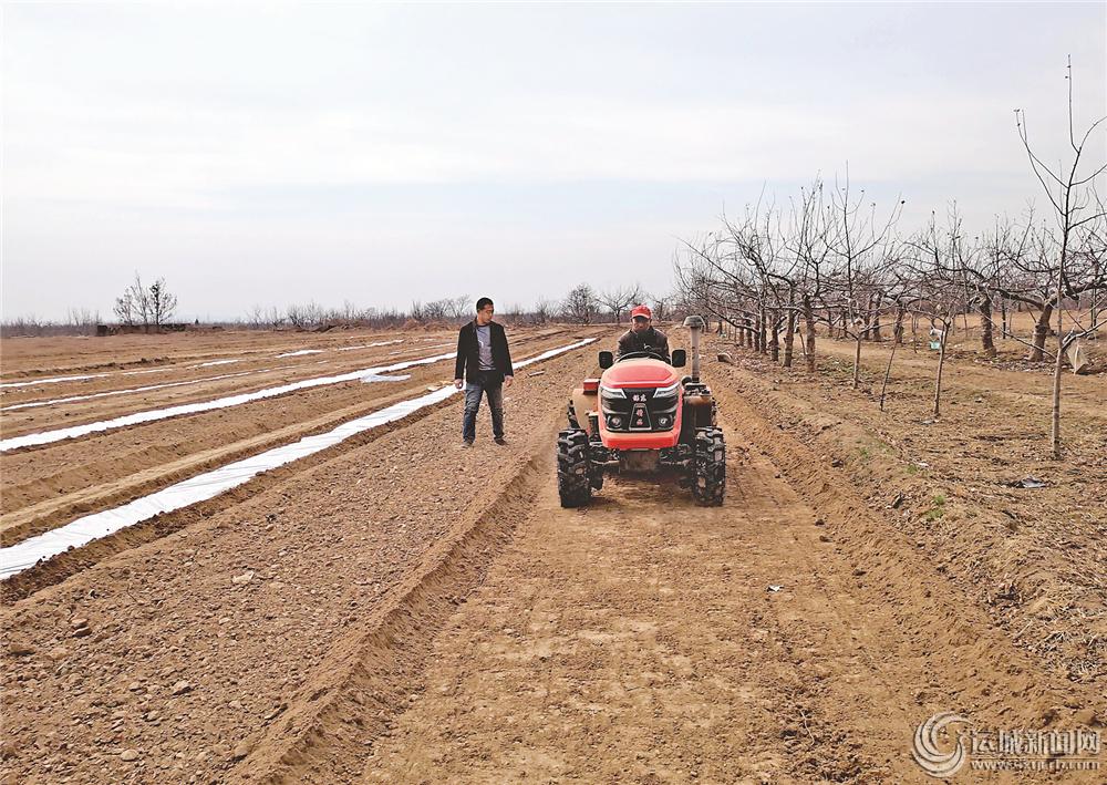 2月23日,在万荣县贾村乡“重茬矮化密植新品种新模式”示范园区,县果业发展中心组织技术人员对土壤进行消毒作业。 记者 冯革才 摄