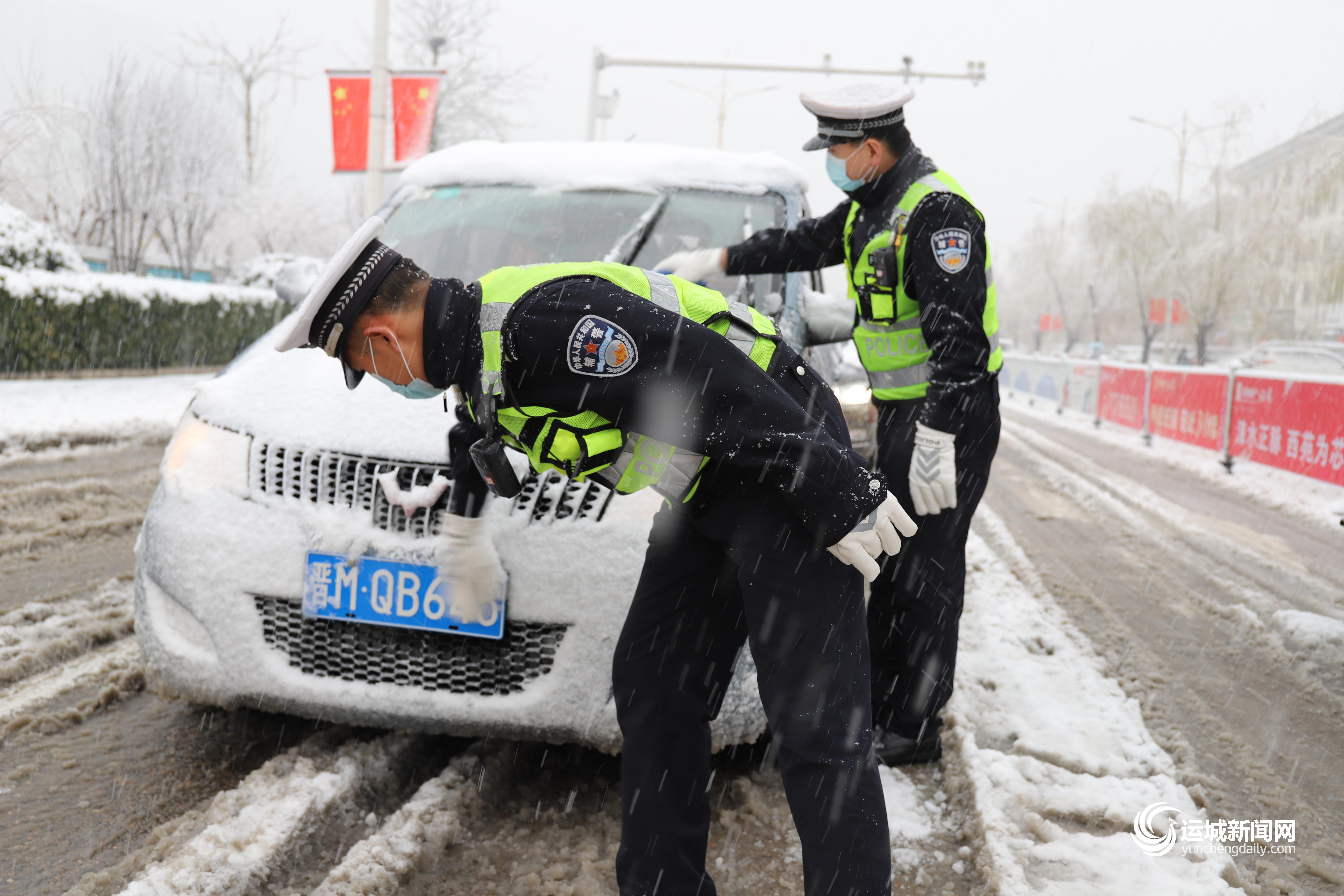当天,全市各级交管部门在城市易堵路段科学部署警力,有效地保障了雪天道路交通安全畅通有序和辖区群众平安出行。同时,执勤民警积极帮扶受困群众,为抛锚车辆实施救援。