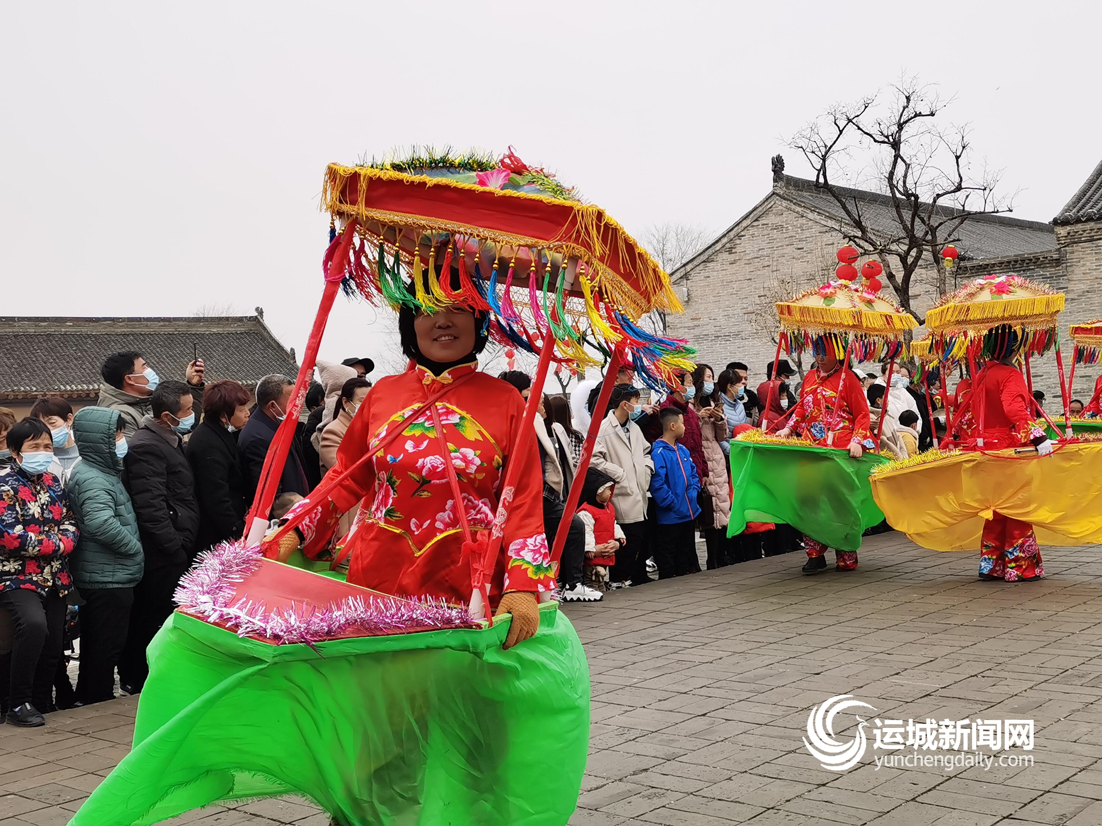 ▲2月26日,游客在岚山根运城印象体验地观看民俗表演“划旱船”。记者 景斌 摄