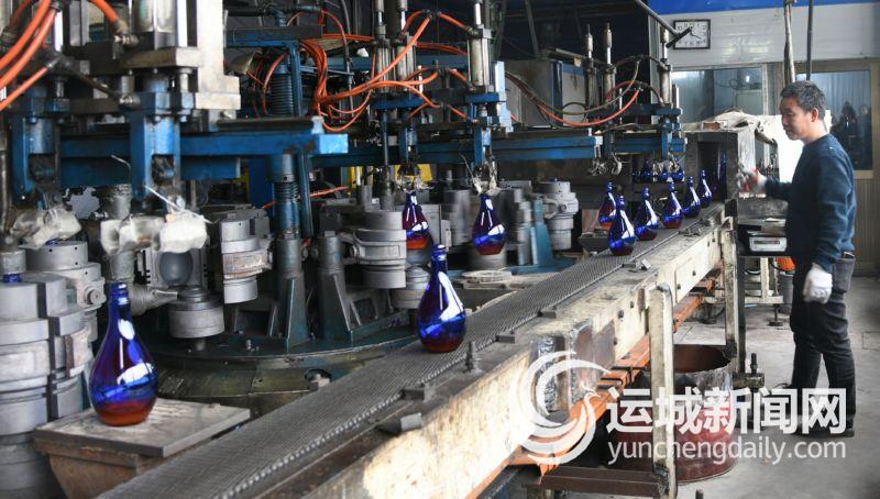 3月2日,闻喜县英发玻璃制品有限公司车间工人在生产玻璃酒瓶。