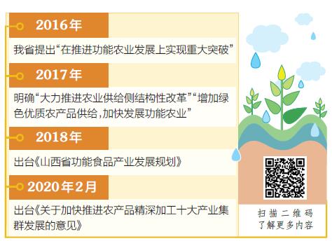 特色是山西农业最亮的标签,也是最大的潜力。继2018年制定《山西省功能食品产业发展规划》之后,2020年2月我省又出台了《关于加快推进农产品精深加工十大产业集群发展的意见》,把培育壮大农产品精深加工十大产业集群作为实施农业“特”“优”战略的主抓手,十大产业集群之一就包含功能食品产业集群。