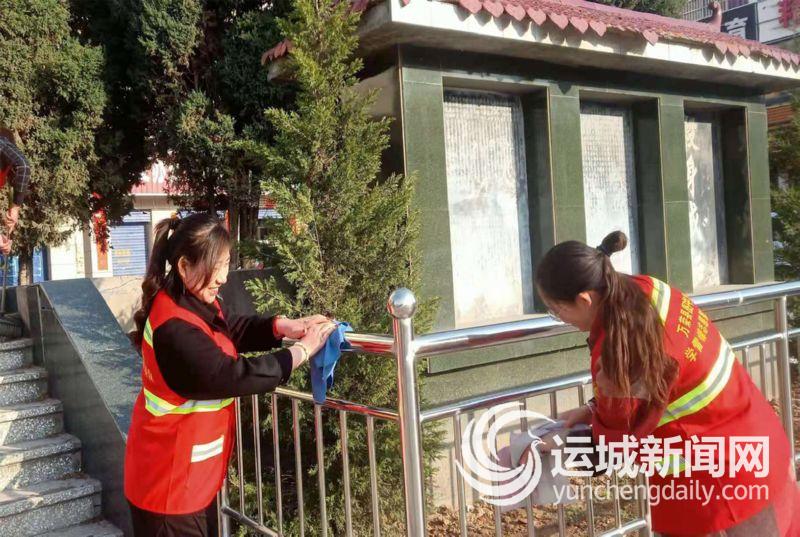 近日,万荣县图书馆的学雷锋志愿者,在该县烈士纪念碑前擦拭栏杆、清理环境卫生。