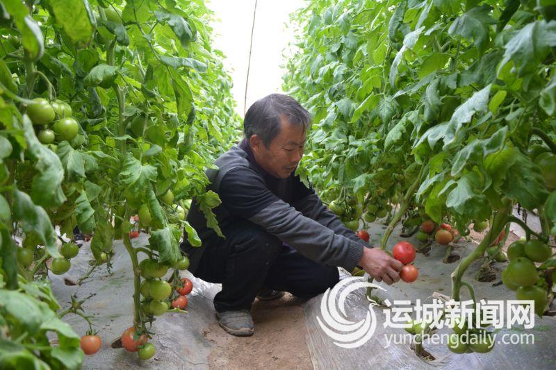 3月8日,盐湖区大渠办北孙坞村菜农在观察西红柿长势。