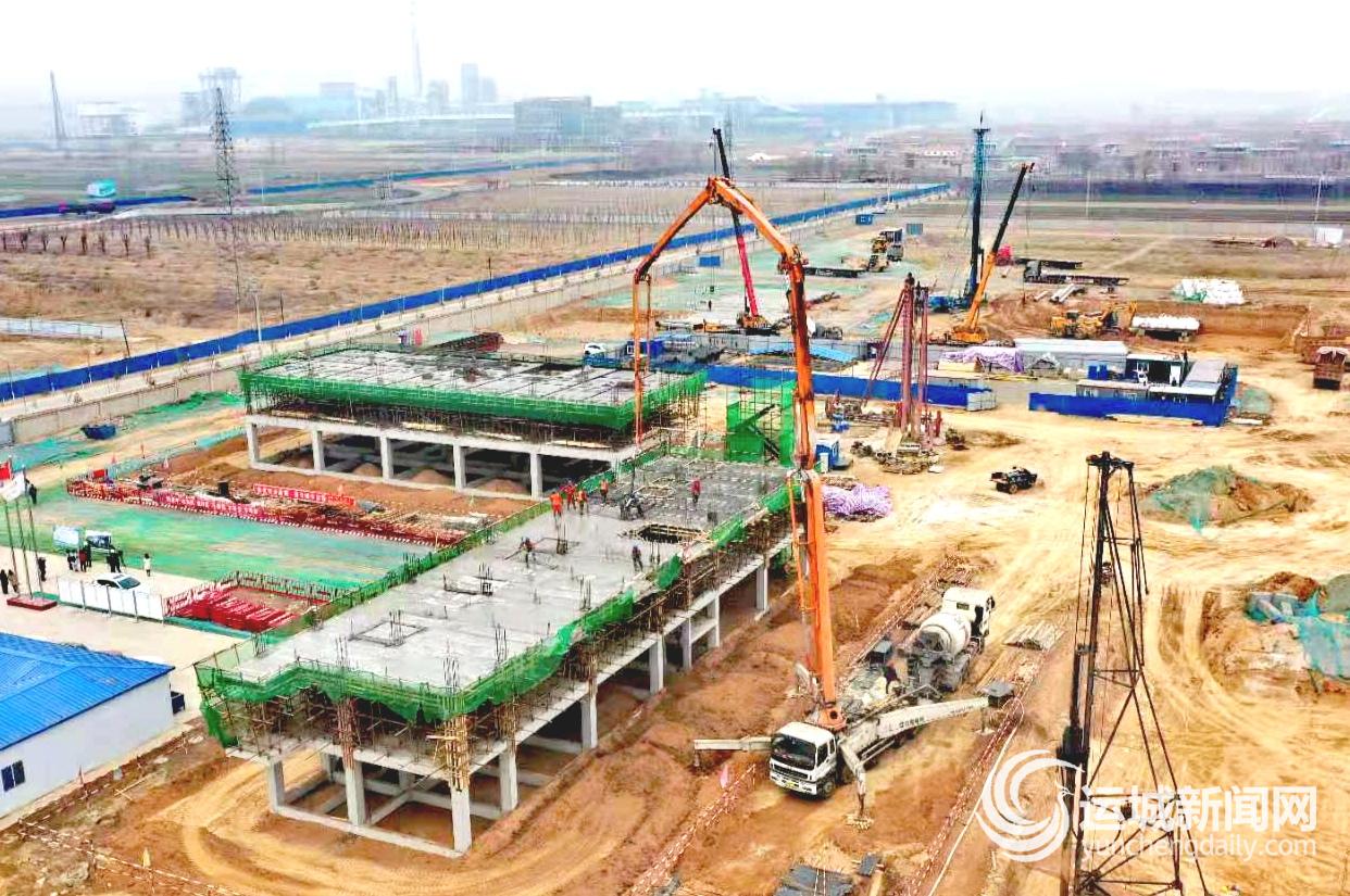 在新绛经济技术开发区热电联产项目(园区循环经济多联供能源岛)建设现场,一台混凝土搅拌车正通过混凝土泵车的长臂向宿舍楼二楼输送水泥,十余名工人快速刮平水泥,以防堆砌。不远处不时地传来挖掘机、压路机作业的轰鸣声。