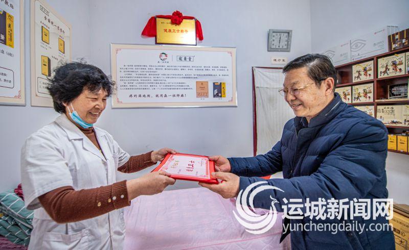 3月8日,中国抗衰老促进会理事会理事、运城市中医医院原书记杨东涛,给市区寇鑫堂健康馆按摩师段彩萍颁发“健康卫士”奖牌和证书。