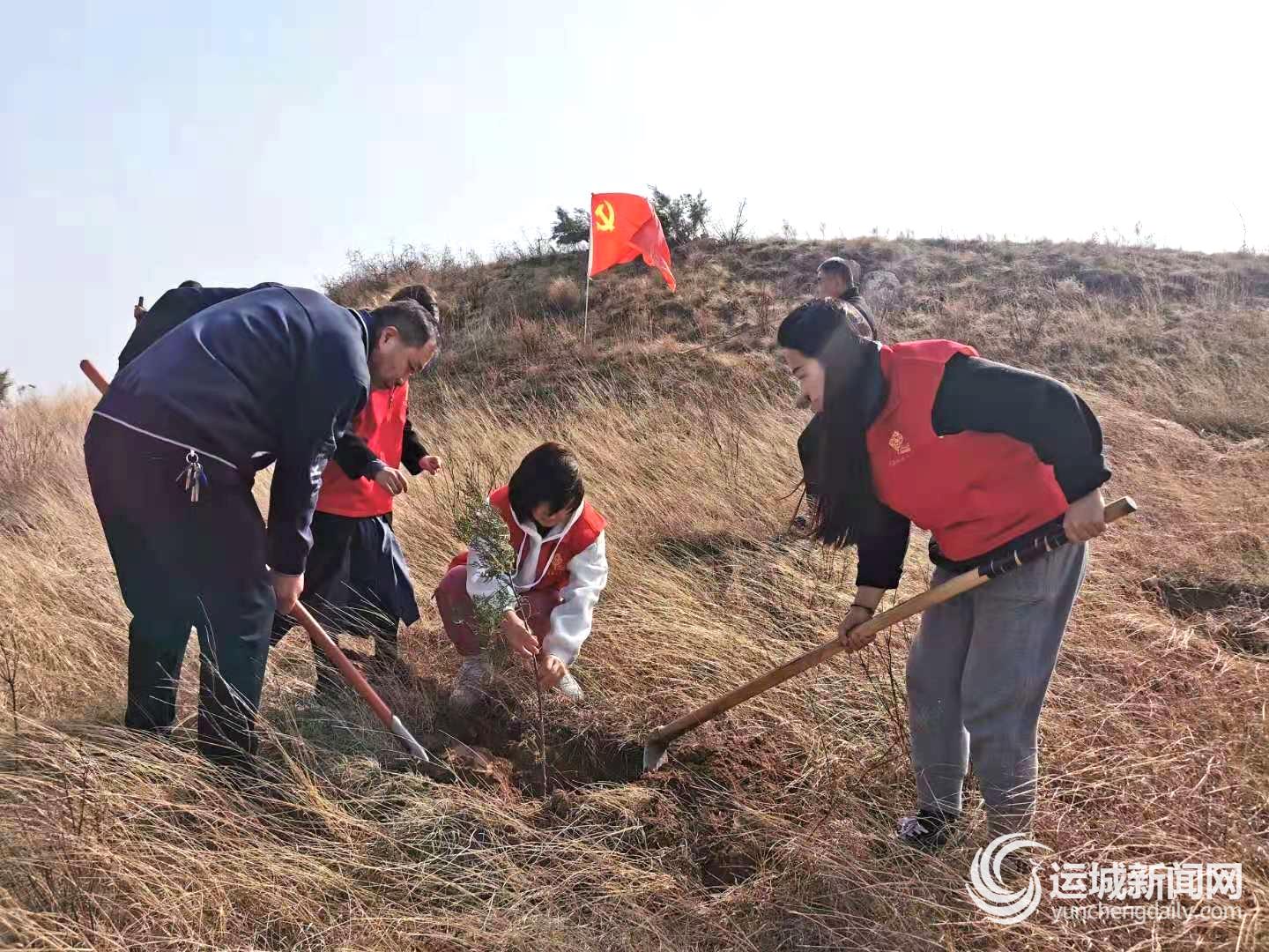 3月12日上午,闻喜县龙海社区开展以“播种绿色,拥抱春天”为主题的植树活动,社区党员干部和志愿者驱车来到该县河底镇酒务头村文家坡进行义务植树。