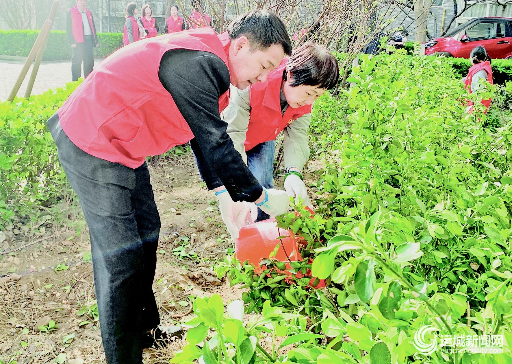 在运城市御溪物业公司员工的带动下,部分居民也加入了植树活动。水岸华庭小区居民刘先生为刚栽好的树苗浇水,他说:“参加植树活动很有意义,不仅锻炼了身体,还给小区增添了绿色。”