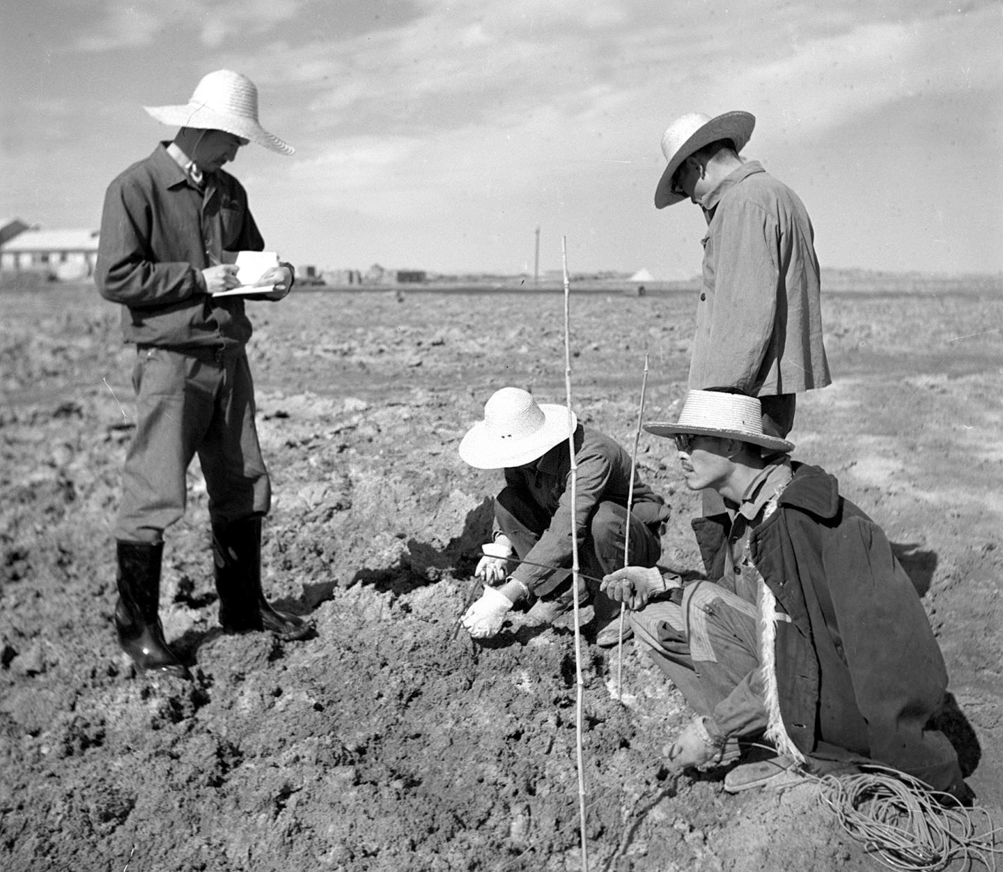 ▲1978年科研人员在柴达木盆地察尔汗盐湖测量溶洞(资料照片) 新华社发