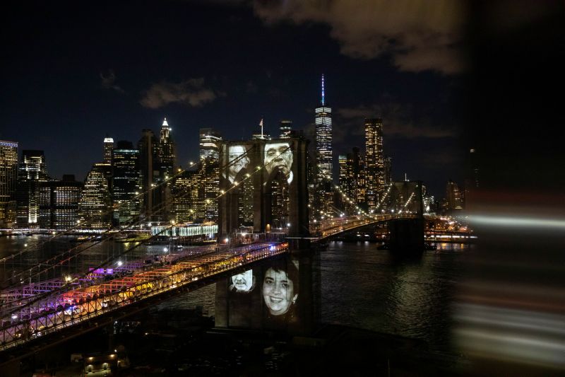 3月14日,美国纽约市举行纪念活动,该市超3万名新冠逝者照片被投射到布鲁克林大桥上悼念。 新华社发